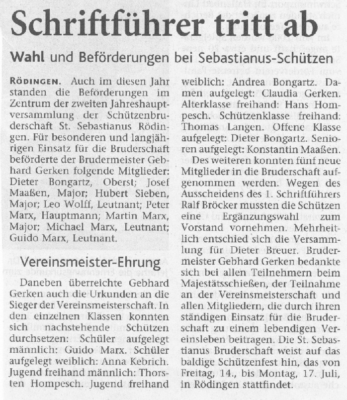 Ergänzungswahl zum Vorstand Brudermeister Gebhard Gerken bedankte sich bei allen Teilnehmern um das Majestätsschiessen, der Teilnahme an der Vereinsmeisterschaft und allen Mitgliedern, die durch ihren ständigen Einsatz für die Bruderschaft zu einem lebendigen Vereinsleben beitragen.