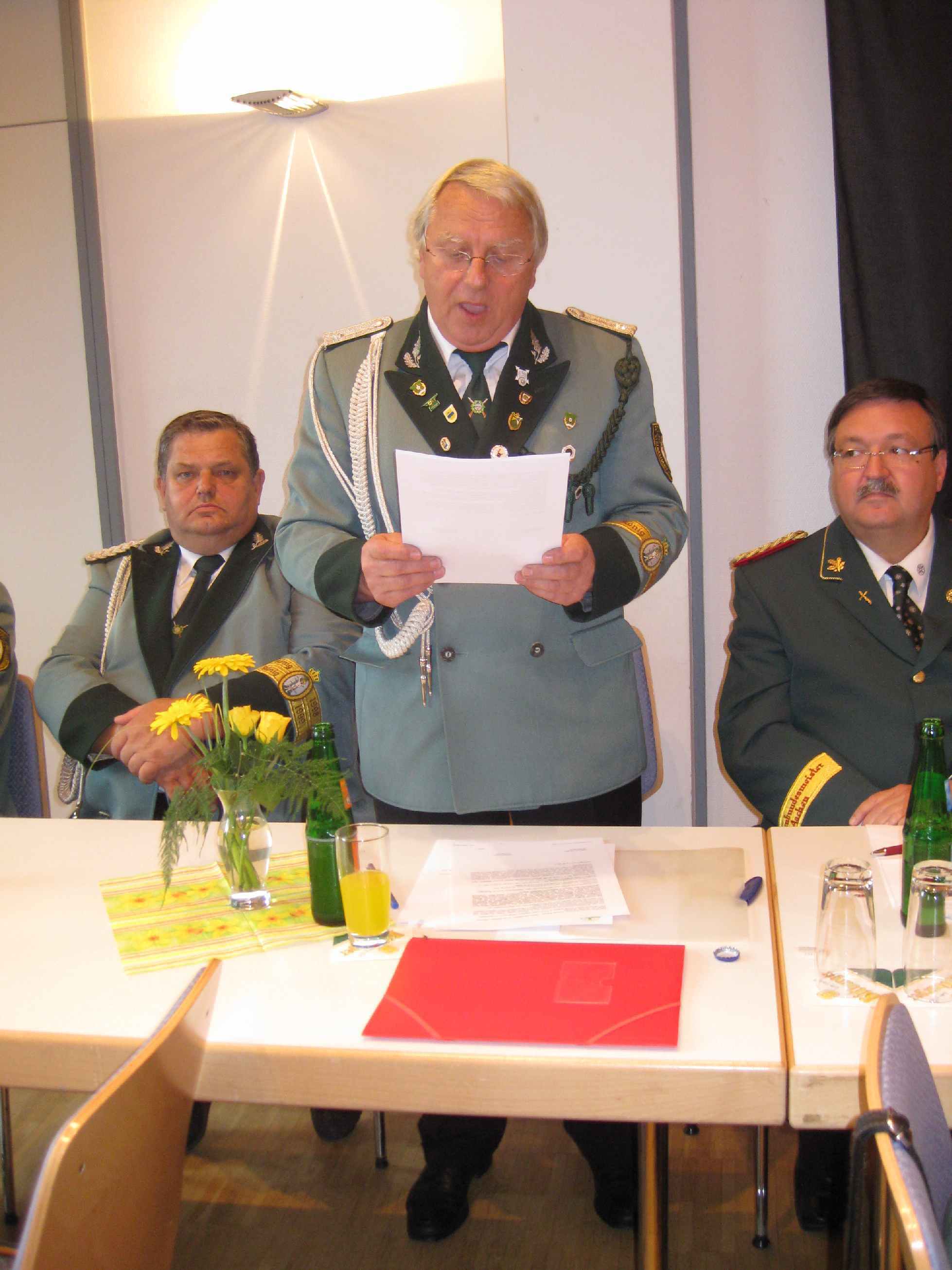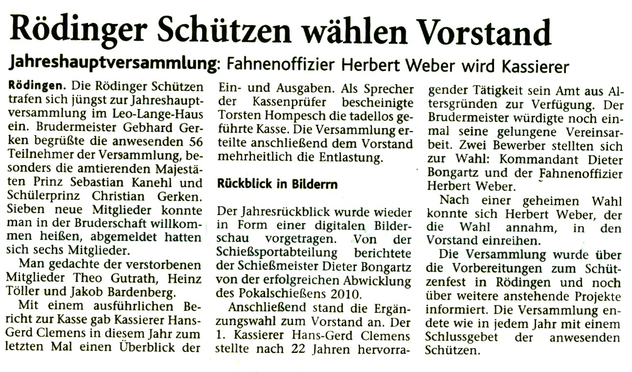 Der erste Brudermeister Gebhard Gerken begrüßte die ca. 60 Schützen-Schwestern und -Brüder zur I. Jahreshauptversammlung 2011 im Leo Lange Haus. Namentlich begrüßt wurden die anwesenden Majestäten Prinz Sebastian Kanehl und Schülerprinz Christian Gerken. Den Kranken Mitgliedern der Bruderschaft wünschte er eine schnelle Genesung und richtete auch den Gruß an die älteren Mitglieder, die nicht mehr an der Versammlung teilnehmen können. Ein Rückblick auf die Ereignisse des Jahres 2010, ob aus Vereinsicht, aus der Umgebung im Jülich Land oder weltweit führte nochmals die Schnelllebigkeit des Jahres 2010 vor Augen.