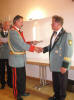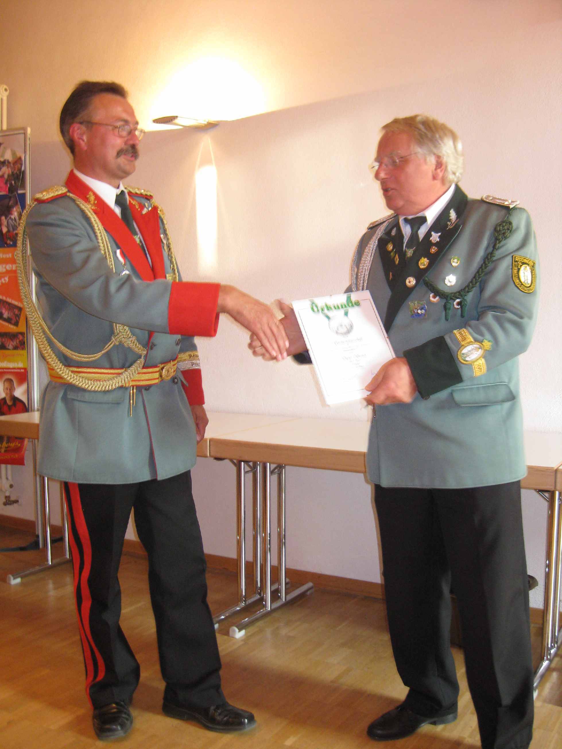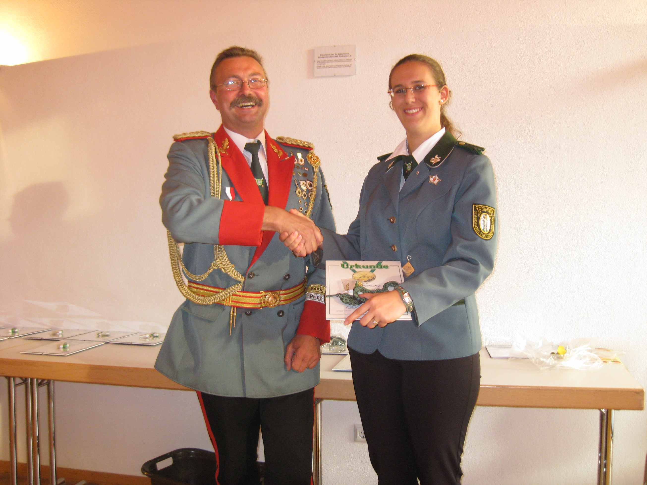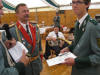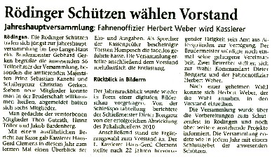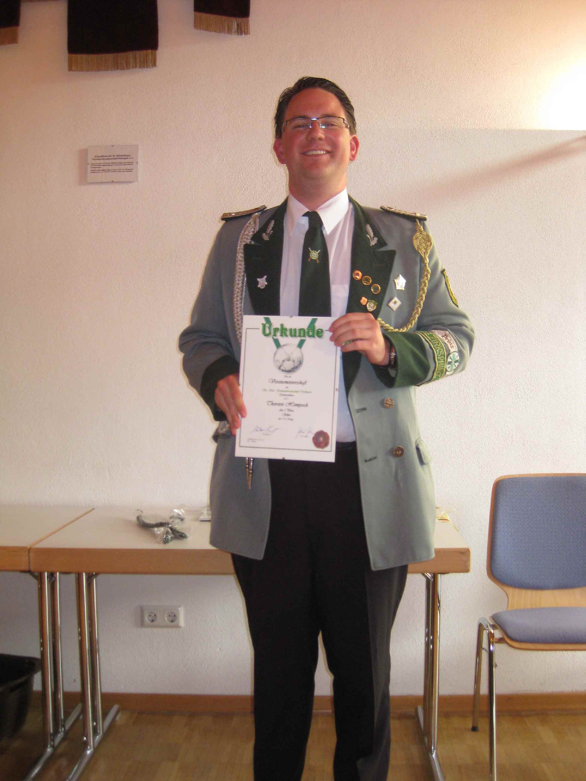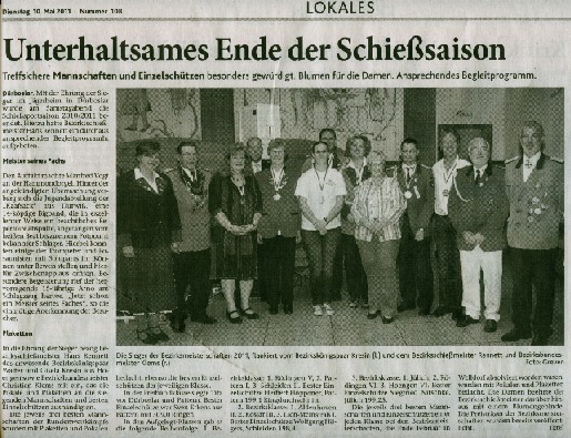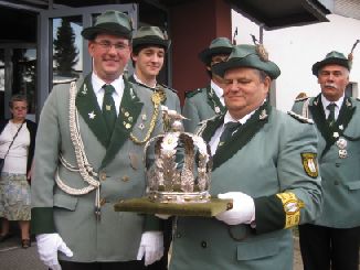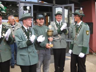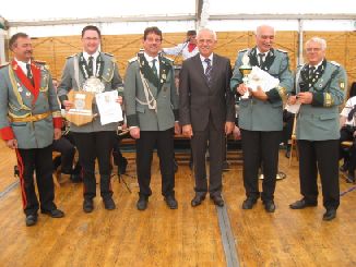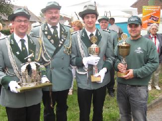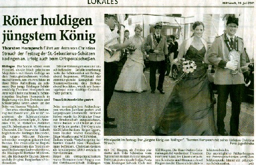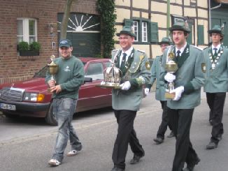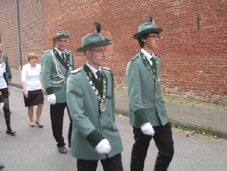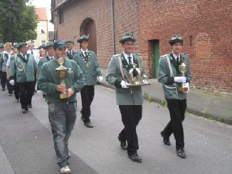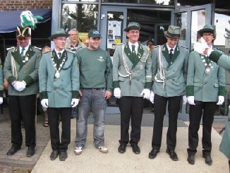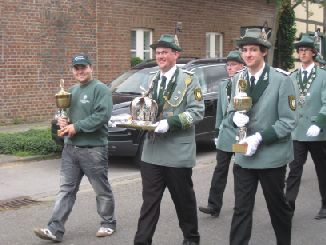 24.06.2011 Zweite Jahreshauptversammlung Der jüngste König von Rödingen Der jüngste König von Rödingen (Quelle: Jülicher Nachrichten Di, 28. Jun. 2011 ) Hompesch (23) trifft mit 16. Schuss. Clemens das Schulterband verliehen. Rödingen. „Der jüngste König von Rödingen“, Thorsten Hompesch (23), führt im nächsten Regentenjahr die St. Sebastianus Schützenbruderschaft Rödingen an. Als einziger Bewerber um die Königswürde traf er den Vogel am Fronleichnamstag mit dem 16. Schuss. Prinz ist sein jüngerer Bruder Stephan Hompesch, der Schülerprinz heißt Kevin Abels. Doch vor der Feier des gut besuchten Familientages stand die Fronleichnamsprozession als „fester Bestandteil im Schützenwesen auf dem Programm“, wie Brudermeister Gebhard Gerken bei der Jahreshauptversammlung im Leo-Lange-Haus betonte. Nach vier Jahren im Amt kandidierte der „Superpraktiker“ Dieter Breuer nicht mehr als Schriftführer, seine Nachfolgerin heißt Andrea Bongartz. Sie ist das erste weibliche Vorstandsmitglied der Schützenbruderschaft. Zu neuen Kassenprüfern wurden Volker Lenzen, Tobias Mielke und Günter Weber gewählt. Höhepunkt der Versammlung waren Auszeichnungen und Beförderungen. Gast war Diözesanbrudermeister Wolfgang Genenger, „Chef von 65. 000 Schützen im Diözesanverband Aachen“, der dem 70-jährigen Hans-Gert Clemens das Schulterband zum St. Sebastianus-Ehrenkreuz verlieh. Der Geehrte leistete 25 Jahre Vorstandsarbeit, davon 22 Jahre als erster Kassierer, und gilt als „Aushängeschild der Bruderschaft“. Obwohl er eine solch hohe Auszeichnung im Vorfeld ausdrücklich nicht gewünscht hatte, zeigte er sich sehr gerührt. Ferner wurde Konstantin Maaßen aufgrund seiner Verdienste zum General befördert, Hubert Sieben zum Oberstleutnant und Daniel Dohle zum Leutnant. Die Bruderschaft verzeichnet sechs Austritte, konnte aber auch zwei neue Mitglieder begrüßen, davon eines aus Düren-Lendersdorf. Die erste Mannschaft darf sich über den Aufstieg in die höchstmögliche Diözesanklasse freuen. Als Tabellenfünfter in der 2. Bereichsklasse Aachen Gruppe A konnte sich die 2. Mannschaft behaupten, auf dem sechsten Tabellenplatz dieser Klasse die 4. Mannschaft (beide Freihand). Weil für die Schüler-Mannschaft nicht genügend Jugendliche zur Verfügung stehen, werden in der Saison 2010/11 keine Rundenwettkämpfe geschossen. Die 5. Mannschaft (aufgelegt) konnte sich auf dem ersten Platz in der 1. Bezirksklasse Jülich behaupten. Somit ist kein Aufstieg mehr möglich. Die 6. Mannschaft belegte den 2. Platz in der 3. Bezirksklasse Jülich und ist einer beiden Aufsteiger in zweite Bezirksklasse. Ein Vergleichswettkampf zwischen beiden Teams wird wieder ins Auge gefasst. Die Teilnahme der Bruderschaft bei Pokalturnieren war äußerst erfolgreich. Zahlreiche Dankesworte wurden zudem für die große Beteiligung an den Diözesanschützentagen gesprochen. (ptj) Ausgezeichnete Schützen bei Meisterschaft Vereinsmeisterschaft, Jungschützen weiblich: Carina Gerken, 112 Ringe; männlich: 1. Michael Hirsch (132), 2. Christian Gerken (121), 3. Tobias Mielke (118). Damenklasse 1: Andrea Bongartz (91). Damenklasse 2: Renate Hirsch (96), Claudia Gerken (95), Rita Abels (86). Schützenklasse: Michael Gerken (143), 2. Thorsten Hompesch (137), 3. Andrea Bongartz (132). Altersklasse: 1. Herbert Weber (130), 2. Hans Hompesch (129), 3. Manfred Mielke (123). Offene Klasse aufgelegt: 1. Leo Wolff (148), 2. Dieter Bongartz (147), 3. Michael Niehsen (147). Senioren 1: 1. Konrad Langen (100), 2. Dieter Breuer (100). 3. Konstantin Maaßen (100). Senioren 2: 1. Heinz Breuer (97), 2. Fred Bongartz (92). Für dreimalige Teilnahme in Folge an der Meisterschaft ohne Platzierung unter den ersten Drei erhielten Hubert Sieben und Martin Marx die grüne Schießschnur sowie Peter Marx und Gebhard Gerken die grüne Eichel. (ptj).