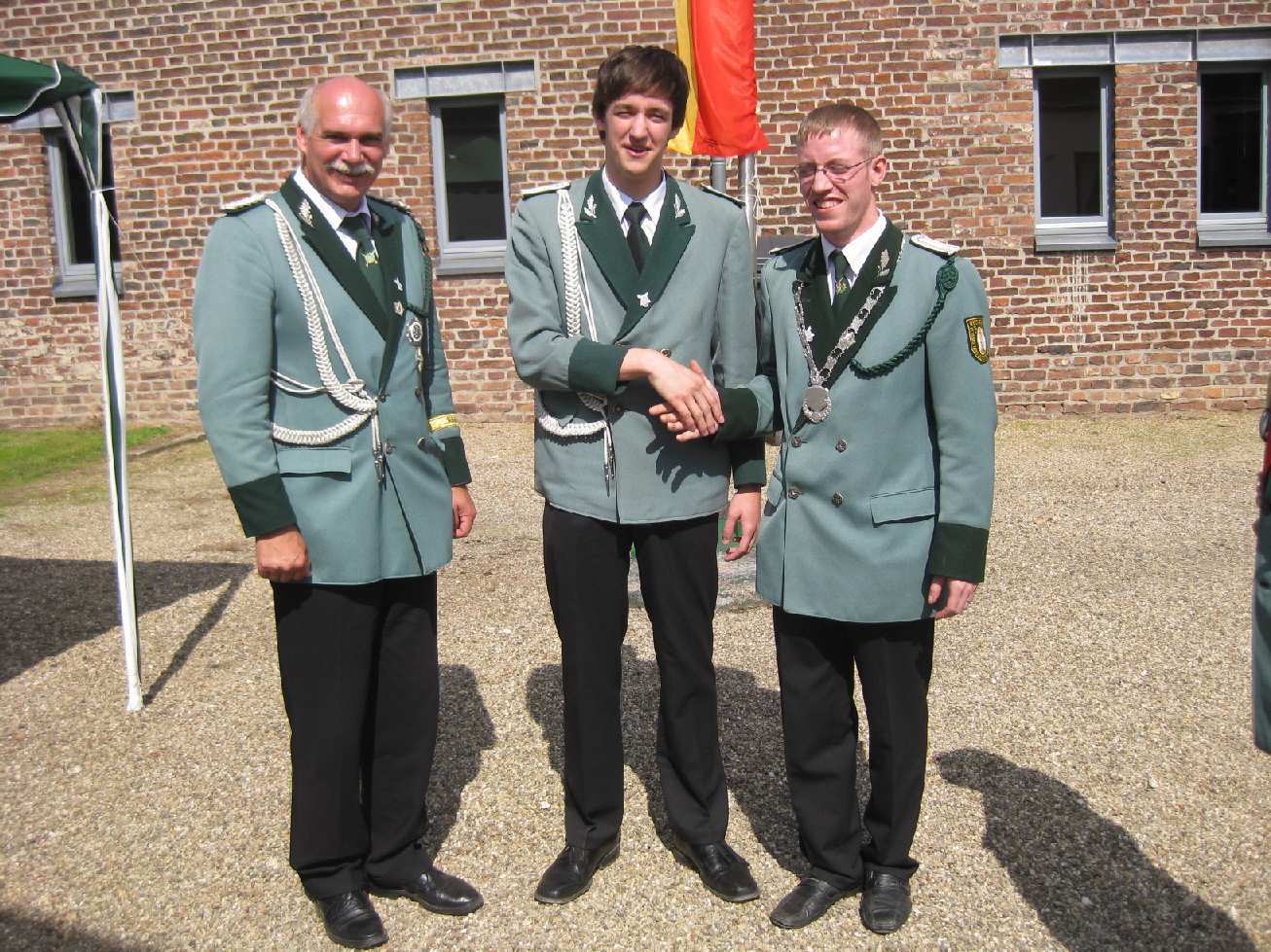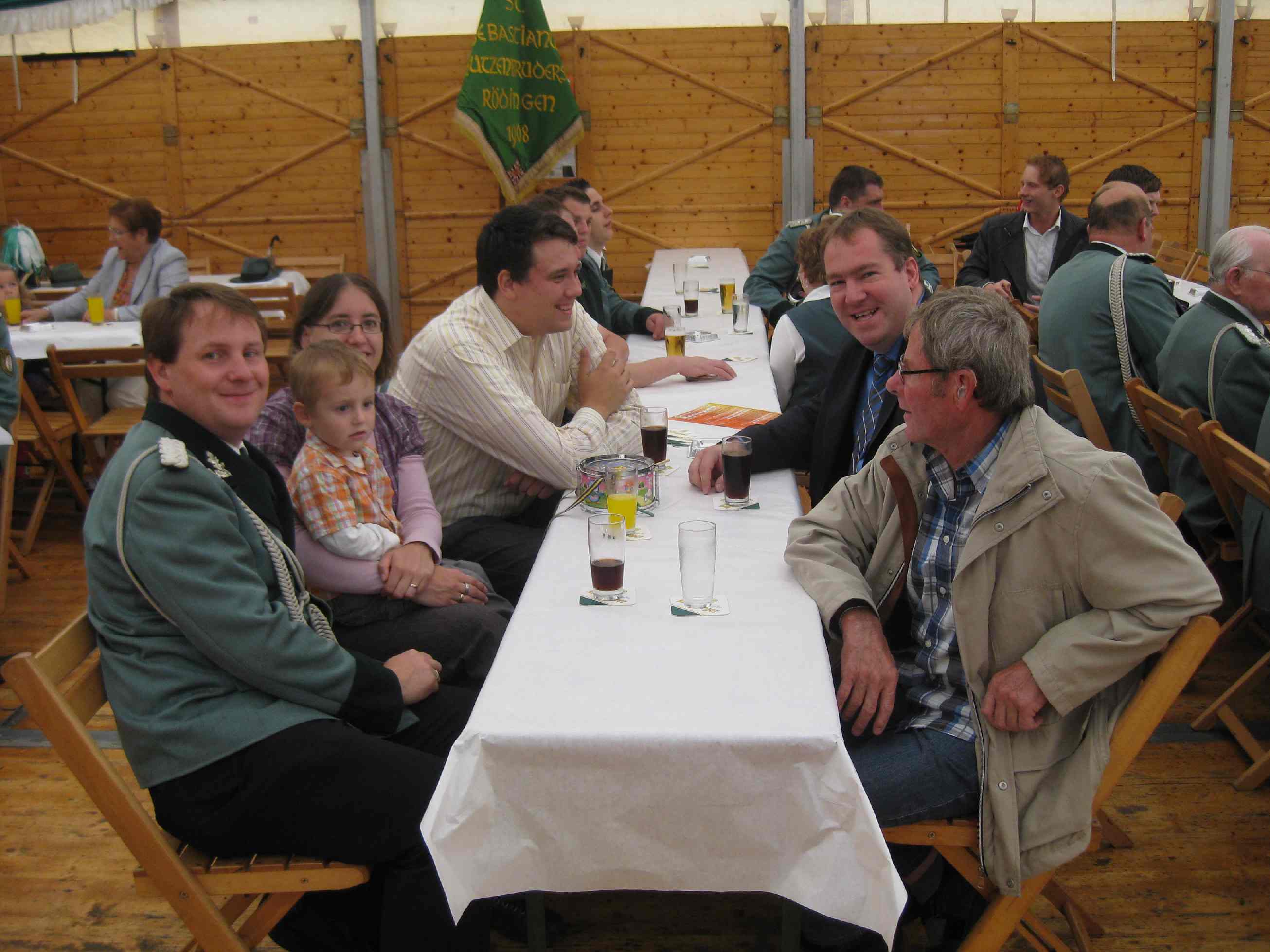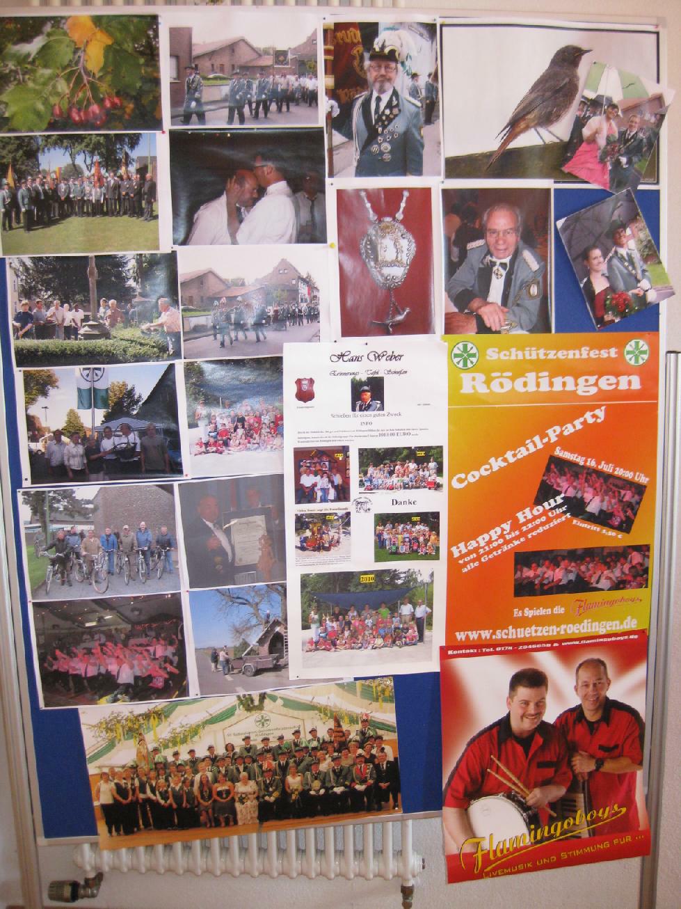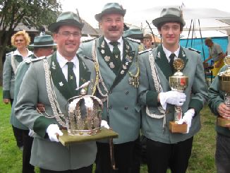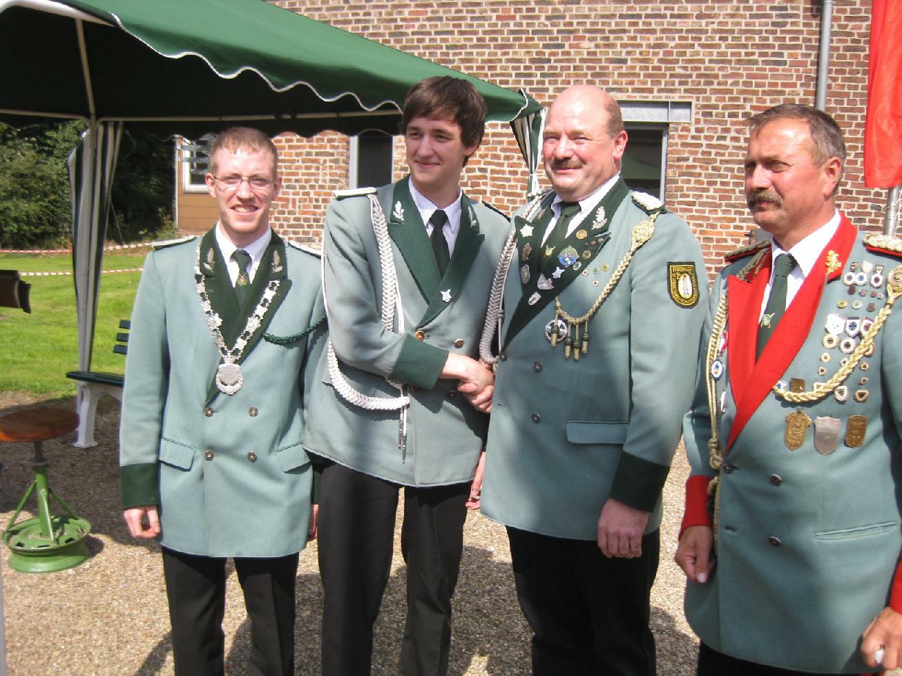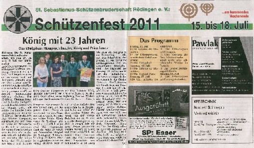 23.06.2011 Fronleichnam mit Familientag und Königsvogelschuss Der Tag begann für die Schützen traditionsgemäß mit der Teilnahme an der Heiligen Fronleichnams-Messe, die in diesem Jahr in der Titzer Kirche St. Cosmas und Damian gefeiert wurde. Anschließend freuten sich alle Besucher und Schützen über das beständige Wetter ohne Regen und genossen den Familientag rund ums Leo-Lange-Haus in Rödingen. Die neue große Riesenrutsche begeisterte die kleinen Kinder und auch so manchen Jugendlichen! Der Grillstand, die Cafeteria und der Eisstand wurden neben den Getränken reichlich genossen und schmeckten sehr gut. Viele nahmen am Schießen der Ortsvereine um den Ortswanderpokal und am Ausschießen der Hans Weber Erinnerungstafel teil. Beim Preisvogelschießen hatte man den Eindruck, dass der eine oder andere es zur Übung nutzte, um beim späteren Majestätsschießen gut auszusehen. Auf dem Schützenfest im Juli werden sie gekrönt und regieren dann für ein Jahr: König Thorsten Hompesch Prinz Stephan Hompesch Schülerprinz Kevin Abels Die Übergabe der Insignien und der kleine musikalische Umzug begleitet vom Jugendmusikzug Fidelio Eisdorf schlossen den offiziellen Teil. Gemütlich gefeiert wurde noch bis in den Abend hinein. Die St. Sebastianus Schützenbruderschaft Rödingen bedankt sich bei allen Gästen.