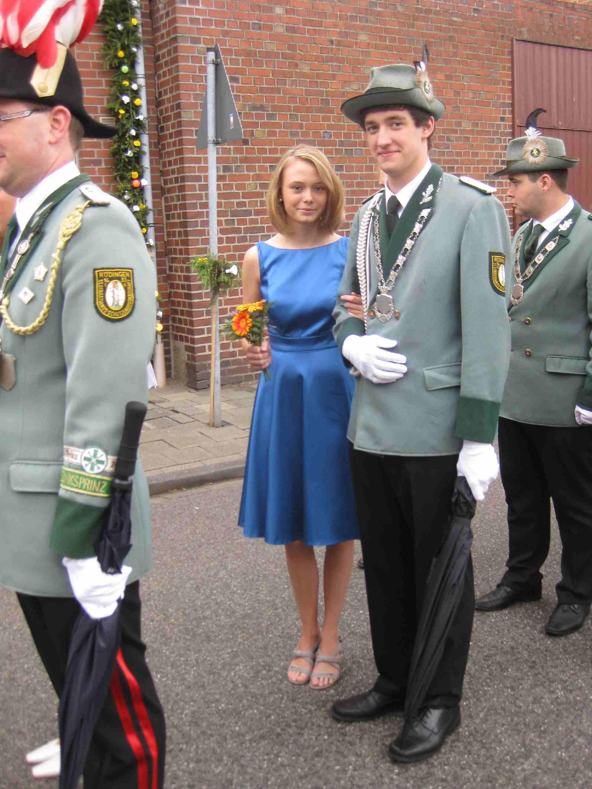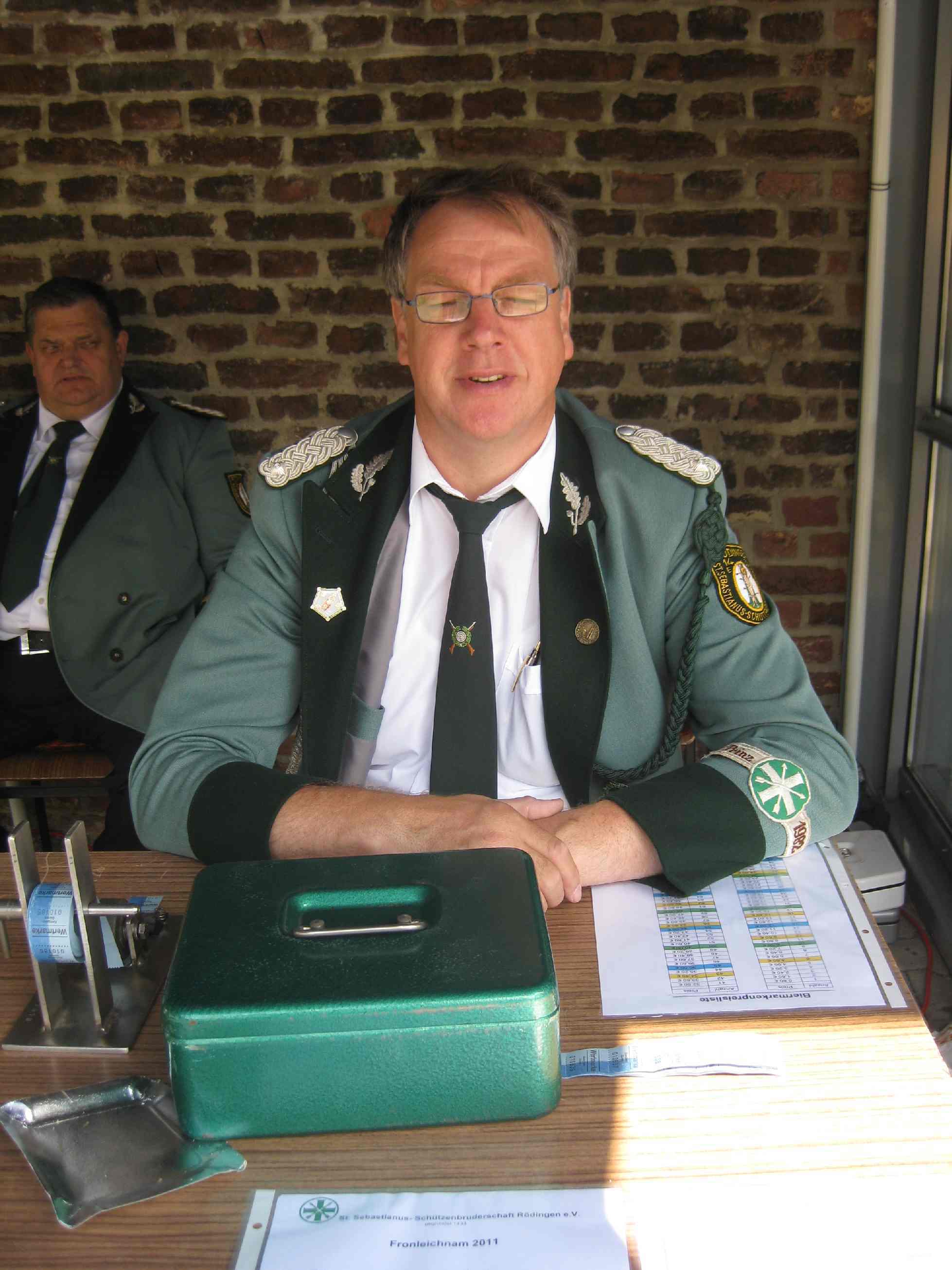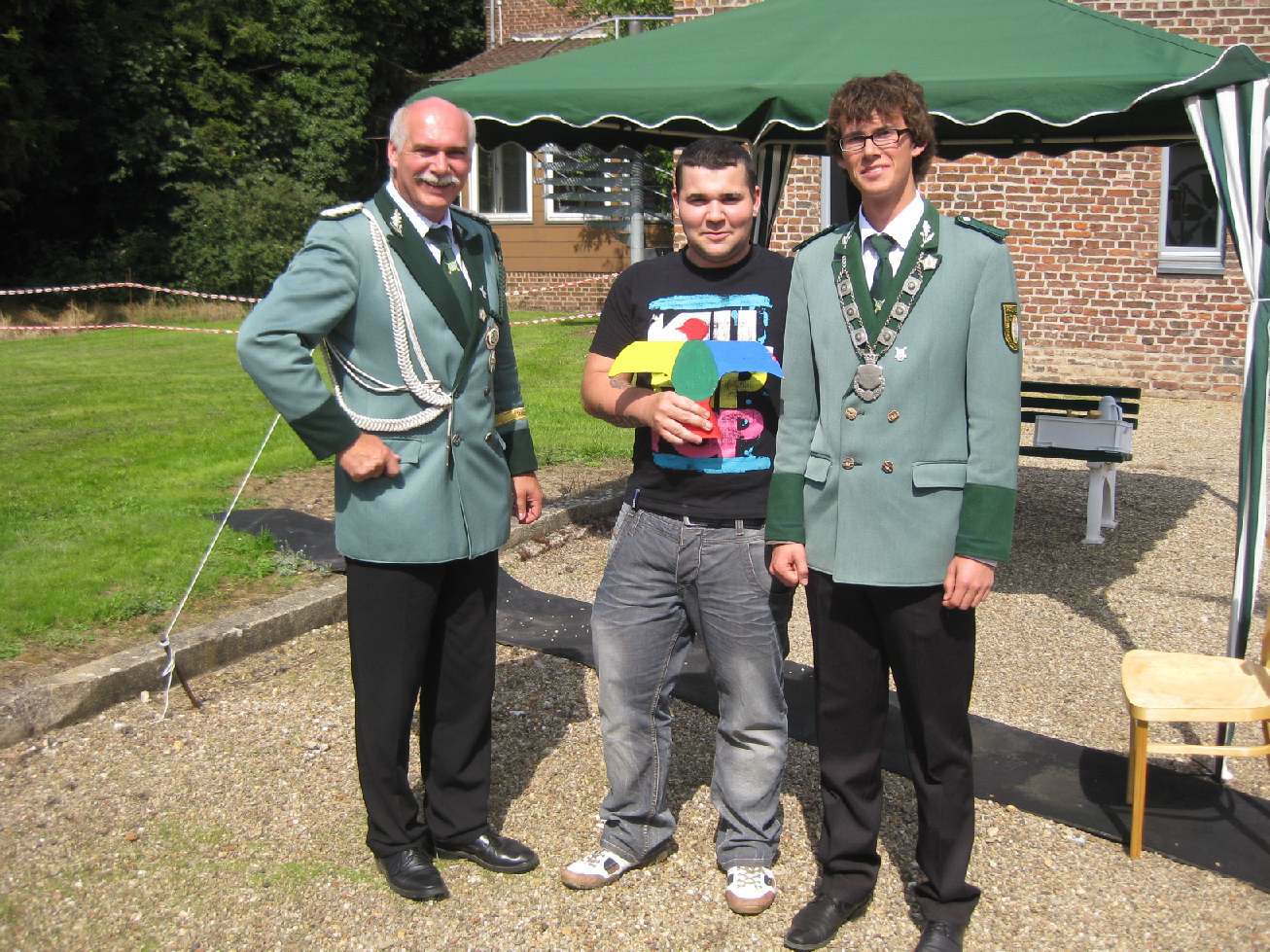 23.06.2011 Fronleichnam mit Familientag und Königsvogelschuss Der Tag begann für die Schützen traditionsgemäß mit der Teilnahme an der Heiligen Fronleichnams-Messe, die in diesem Jahr in der Titzer Kirche St. Cosmas und Damian gefeiert wurde. Anschließend freuten sich alle Besucher und Schützen über das beständige Wetter ohne Regen und genossen den Familientag rund ums Leo-Lange-Haus in Rödingen. Die neue große Riesenrutsche begeisterte die kleinen Kinder und auch so manchen Jugendlichen! Der Grillstand, die Cafeteria und der Eisstand wurden neben den Getränken reichlich genossen und schmeckten sehr gut. Viele nahmen am Schießen der Ortsvereine um den Ortswanderpokal und am Ausschießen der Hans Weber Erinnerungstafel teil. Beim Preisvogelschießen hatte man den Eindruck, dass der eine oder andere es zur Übung nutzte, um beim späteren Majestätsschießen gut auszusehen. Auf dem Schützenfest im Juli werden sie gekrönt und regieren dann für ein Jahr: König Thorsten Hompesch Prinz Stephan Hompesch Schülerprinz Kevin Abels Die Übergabe der Insignien und der kleine musikalische Umzug begleitet vom Jugendmusikzug Fidelio Eisdorf schlossen den offiziellen Teil. Gemütlich gefeiert wurde noch bis in den Abend hinein. Die St. Sebastianus Schützenbruderschaft Rödingen bedankt sich bei allen Gästen.