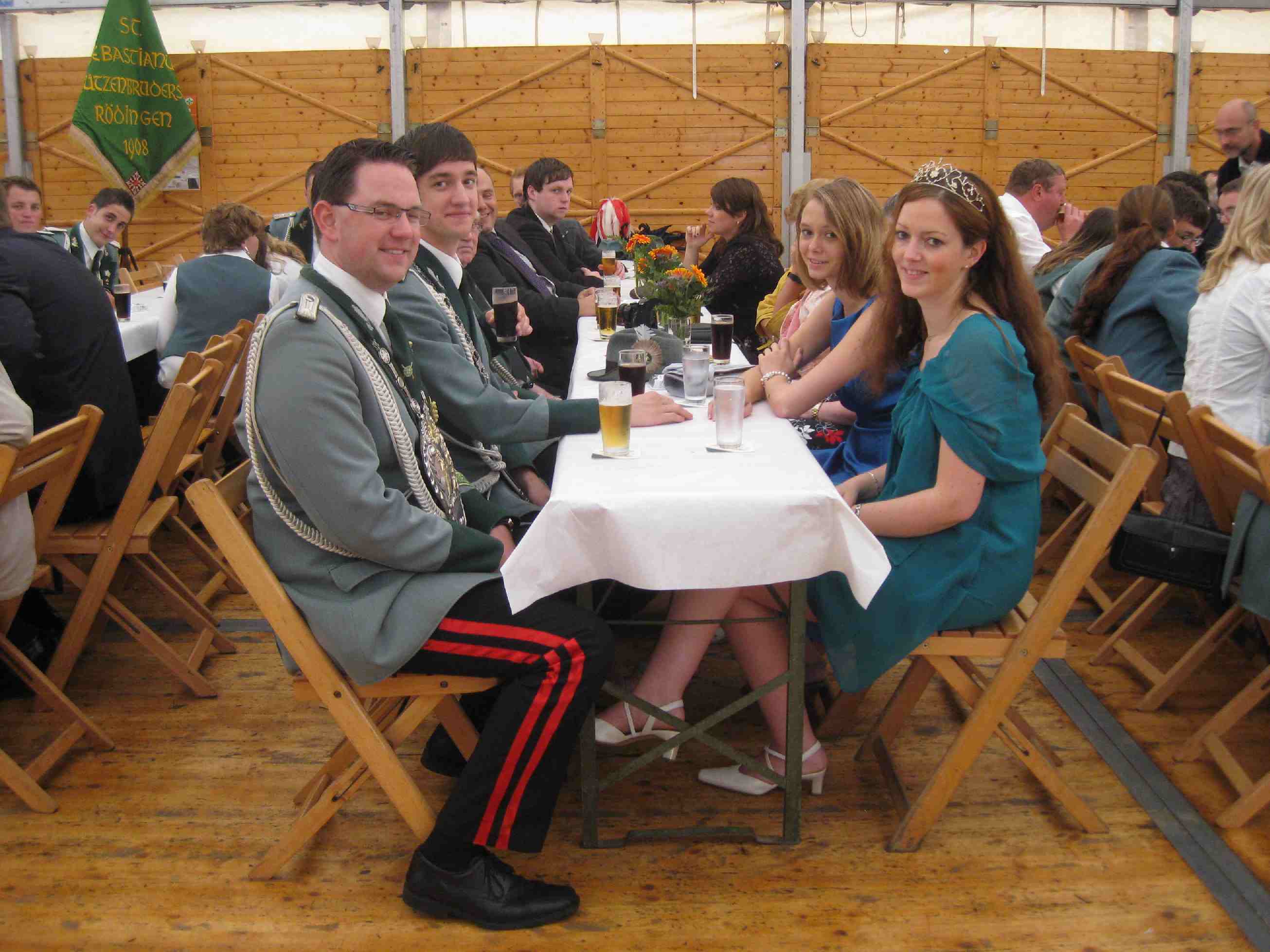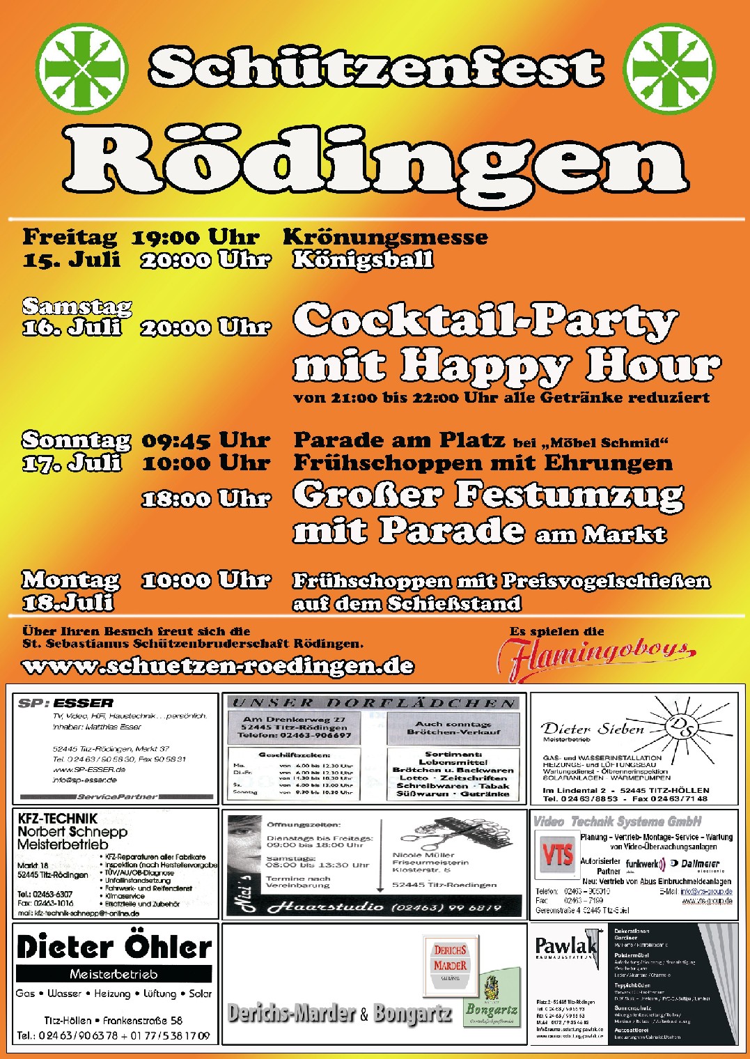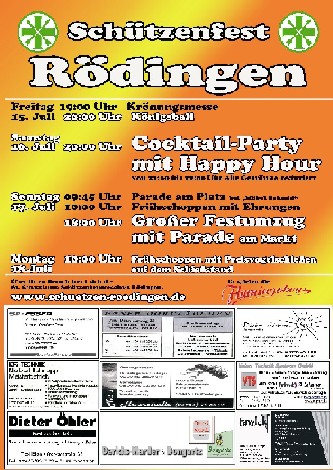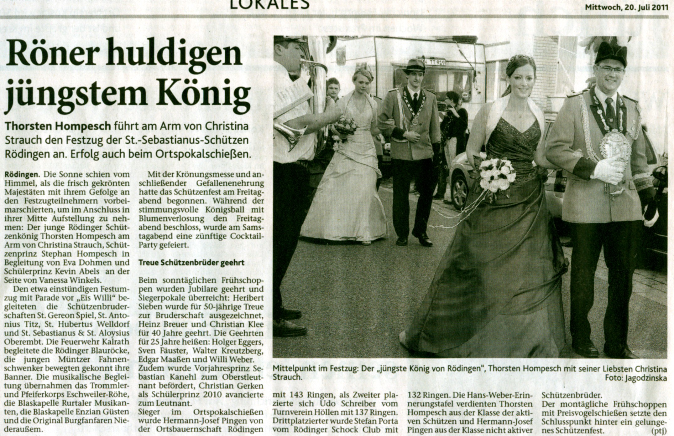 15. bis 18. Juli 2011 Schützenfest Eine Bruderschaft im Wandel: Tradition kombiniert mit modernen Akzenten St. Sebastianus Schützenbruderschaft Rödingen feierte Ihr diesjähriges Schützenfest Nach Wochen intensiver Vorbereitungen wurde das Schützenfest als Höhepunkt des Jahres gefeiert. Im Mittelpunkt des Geschehens standen die wohl jüngsten Majestäten des Bestehens: König Thorsten Hompesch mit seiner Königin Christina Strauch, Prinz Stephan Hompesch in Begleitung von Eva Dohmen sowie Schülerprinz Kevin Abels begleitet von Vanessa Winkels. Alle Drei wurden im Rahmen der Krönungsmesse von Präses und Pfarrer Dieter Telerac offiziell in Ihr Amt eingeführt. Im Anschluss an die Krönungsmesse und der traditionellen Gefallenenehrung zogen die frisch gekrönten Majestäten begleitet von einem farbenprächtigen Gefolge ins Festzelt, um gemeinsam mit Freunden, Verwandten und Bekannten den Königsball zu feiern. Die Jugend- und Jung-Schützen haben sich als Organisationsteam zusammen gefunden, um neuen Schwung ins Schützenfest zu bringen. Das Highlight für die jungen Erwachsen aus nah und fern wurde als "Cocktail-Party " am Samstag geplant und wurde ein Erfolg: Volles Zelt und Stimmung pur. Fetzige Musik, fruchtige Cocktails und bunte Knicklichtern fürs handgelenk sorgten für gute Stimmung bis spät in die Nacht hinein. Ob das „Fliegerlied“, Micky Krauses „ich bin Solo“ oder „Tulpen aus Amsterdam“, die Stimmungsband „Flamingoboys“ hatten für jeden Musikwunsch etwas im Repertoire. Der Sonntag startete mit dem Abholen der Majestäten, der Parade bei Möbel Schmid und dem anschließendem Frühschoppen mit Siegerehrung des Ortswanderpokal- und des Hans-Weber-Gedächtnis-Schießens sowie der Ehrung von Jubilaren und „Vorjahres-Majestäten“. Gegen 18.00 Uhr setzte sich unser Großer Festumzug in Bewegung. Gemeinsam mit den zahlreichen Ortsvereinen, den befreundeten Bruderschaften, den Ehrengästen und den vier Musikcorps zogen die Schützen durch Rödingen und Höllen. Den Abschluss des Festzuges bildete die große Parade vor „Eis Willi“, wo leider schon lange keine Eisdiele mehr existiert, aber der Straßenzug immer noch so bezeichnet wird. Am Montag endete das Schützenfest traditionell auf dem Schießstand mit Frühschoppen und Preisvogelschießen , bei dem ebenfalls die Gewinner der diesjährigen Verlosung ermittelt wurden. Bilder und Videos des diesjährigen Schützenfestes finden Sie auf der Homepage www.schuetzen-roedingen.de oder auf Facebook.