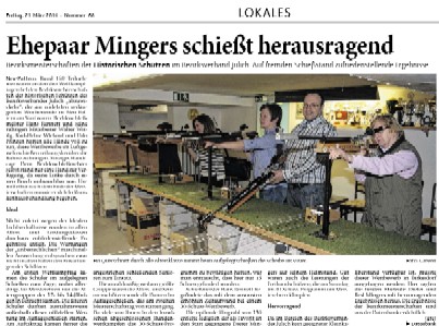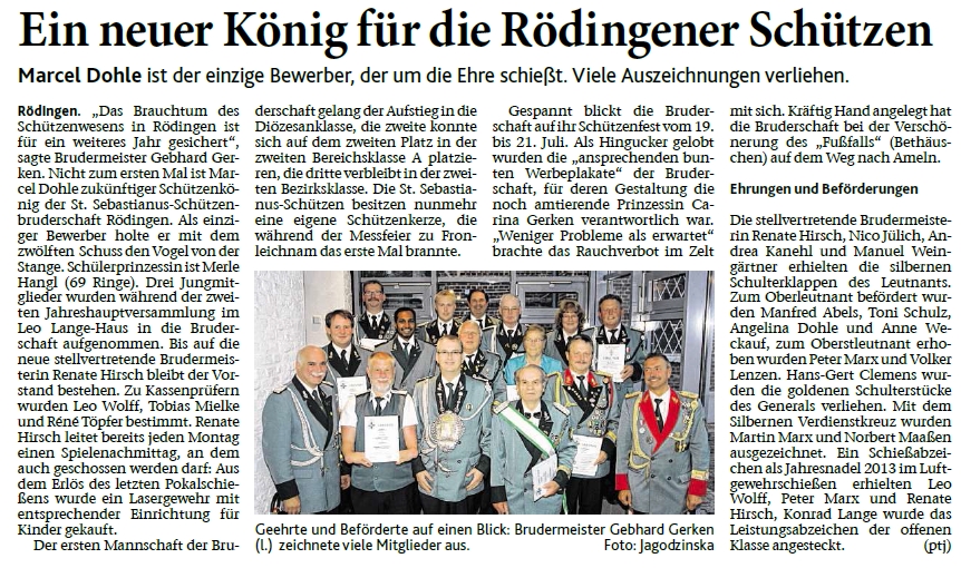 Seit dem Jahr 1992 zählen Hasselsweiler, Spiel, Müntz, Gevelsdorf und Ralshoven dazu und seit 2000 auch Titz, Jackerath und Mündt/Opherten. Der Titel „Wir miteinander“ steht seit 1992 als Logo in Pfarrbrief und Briefkopf. „Wir miteinander‘ hat sich im guten Sinne ereignet. Es bleibt anfanghaft. Wir sind noch auf dem Weg“, fasste Telorac zusammen. Wie später in den Lobreden bei Empfang und Austausch im Leo-Lange-Haus aufgezählt wurde, feierte der leitende Pfarrer 690 Beerdigungen, 289 Taufen und 84 Trauungen, neben den unzähligen „normalen“ Messfeiern im Jahreskreis. Heimat fand er nicht nur in „seinen“ Gemeinden, sondern auch bei den St. Sebastianus-Schützen und im Kirchenchor. Was zeichnet ihn aus? „Seine kräftige (Sing-)Stimme, seine charismatischen Predigten mit menschlichem Bezug, die Würde, die das Schnellsprechertempo in den Gebeten ablöst, und sein unermüdlicher seelsorgerischer Dienst“, äußerten sich die Gratulanten. Telorac wollte die „Menschen in den Gemeinden kennenlernen, besonders in den Gottesdiensten“. Zuvor hatte der Jubilar sich selbst im Pfarrbrief als „jecker Pastur“ bezeichnet, der „alles auf den Kopf stellt“, wie Rödinger Christen vor 25 Jahren seufzend ausgerufen hätten. Bescheiden hatte er deshalb darum gebeten, „keine Geschenke mitzubringen“ weil „die lange Zeit meines Hierseins nicht mein Verdienst ist“.(ptj) (Quelle: Aachener Zeitung online 24.02.2014) 28.03.2014 Freihandschießen ist stark rückläufig Überregionale Leistungsklassen ziehen Saisonbilanz Jülicher Land. Ohne das in vielen Bruderschaften des Bezirksverbandes Jülich der historischen Schützenbruderschaften gepflegte Auflageschießen diskreditieren zu wollen, aber das sportliche Schießen ist das Freihandschießen. Zu den Voraussetzungen ruhige Hand, Ausdauer und Konzentration, die das Auflageschießen erfordert, kommen beim Freihandschießen noch die Körperkraft und Trainingsfleiß hinzu. Das übliche 30-Schuss-Programm einschließlich des Probeschießens nimmt eine gewisse Zeit in Anspruch, in der das Sportgerät auf einer Hand ruht. Die damit verbundenen Anstrengungen haben inzwischen dazu geführt, dass die Bereitschaft zum Freihandschießen stark rückläufig ist, zumal für die älteren Schützen ab 45 Jahren das Auflageschießen eingeführt worden ist und Jugendliche bis zum 14. Lebensjahr ebenfalls aufgelegt schießen dürfen. Ungeachtet dessen pflegen noch zehn Bruderschaften des Bezirksverbandes die Freihanddisziplin. Hinzu kommen noch drei Bruderschaften aus dem Linnicher Raum, die mit Mannschaften aus den Bezirken Heinsberg und Geilenkirchen im Winterhalbjahr an den regelmäßigen Rundenwettkämpfen teilnehmen. Sie sind überregional in den drei Leistungsklassen Diözesanklasse, Bereichsklasse 1a und Bereichsklasse 2a organisiert. Absolute Spitze unter den insgesamt 24 Mannschaften ist St. Martinus Barmen, die die Diözesanklasse mit 28:0 Punkten und einem Ringdurchschnitt von 1159,857 abgeschlossen hat. Alle weiteren Freihandmannschaften aus dem Jülicher Land tummeln sich in den beiden folgenden Klassen. Spitzenreiter in der Bereichsklasse 1a ist die Mannschaft Rödingen I, die völlig überraschend am letzten Wettkampftag an die Spitze gelangt ist, weil der Gast aus Dalheim, der fast über die gesamte Saison in Führung lag, seine beiden besten Schützen nicht einsetzte. Das gab Ärger. Ungewollt steigt Rödingen deshalb in die Diözesanklasse auf, aus der sie im Vorjahr abgestiegen war. Da in der Bereichsklasse 2a der Leistungsunterschied zwischen den acht Teams sehr stark ist, erwägt Staffelleiter Hans Rennett für die nächste Saison eine Neueinteilung. Alle drei Klassen bestanden aus je acht Mannschaften, die ab Oktober 14 Wettkämpfe zu absolvieren hatten. Durchaus ideal, weil die Saison pünktlich zum Beginn der Bezirksmeisterschaften Ende Februar beendet wurde. Schießsport Rundenwettkämpfe der historischen Schützenbruderschaften, Abschlusstabellen: