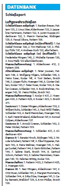 Aufgeführt ist jeweils: Platz Name, Vorname Bruderschaft X 10 Teiler Ringe Luftgewehr aufgelegt 115 Schüler männlich 5 Hamacher, Marvin St. Seb. Rödingen 4 1220 129 Luftgewehr stehend 121 Jugend männlich 2 Hirsch, Michael St. Seb. Rödingen 5 989 257 Luftgewehr stehend 122 Jugend weiblich 1 Scheidemacher, Corinna St. Seb. Rödingen 0 2117 180 Luftgewehr stehend 131 Schützen 1 Langen, Thomas St. Seb. Rödingen 19 524 288 2 Hompesch, Thorsten St. Seb. Rödingen 12 809 277 3 Kanehl, Sebastian St. Seb. Rödingen 7 981 260 Und als Mannschaft den 1. Platz mit 825 Ringen Luftgewehr stehend 141 Altersklasse 4 Hompesch, Hans St. Seb. Rödingen 10 993 269 5 Gerken, Michael St. Seb. Rödingen 6 694 268 8 Langen, Konrad St. Seb. Rödingen 4 1090 252 Und als Mannschaft den 2. Platz mit 777 Ringen Luftgewehr stehend 161 Damen I 1 Kanehl, Andrea St. Seb. Rödingen 9 890 265 3 Gerken, Carina St. Seb. Rödingen 3 2117 233 Luftgewehr aufgelegt 164 Damen II 1 Hirsch, Renate St. Seb. Rödingen 13 297 148