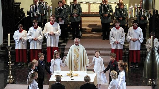 In vielen katholischen Pfarreien empfingen am Weißen Sonntag traditionell Mädchen in festlichen weißen Kleidern und Jungen im feinen Anzug zum ersten Mal die heilige Kommunion. Foto: Jagodzinska JUELICH. In vielen katholischen Pfarreien empfingen am Weißen Sonntag traditionell Mädchen in festlichen weißen Kleidern und Jungen im feinen Anzug zum ersten Mal die heilige Kommunion. Das weiße Kleid steht als Zeichen der österlichen Taufgnade für das neue Leben in Christus. Wegen der Zusammenlegung der Pfarreien werden an den kommenden Sonntagen weitere Erstkommunionen in der Region folgen. In Rödingen gingen zwölf Kommunionkinder aus Rödingen/Höllen, Ameln, Kalrath und Opherten erstmalig zum Tisch des Herrn. Ihr Motto in der Vorbereitung durch Martina Braun und Maria Hintzen-Muckel lautete „In Gottes buntem Lebensgarten“. Passend dazu integrierte Pfarrer Dieter Telorac als kleine Überraschung in seine Festtagspredigt die Plüschmaus „Hannelore“ als Symbol für die Schöpfungsfreude Gottes. Die Maus steht für die Wichtigkeit kleinerer Dinge im Leben. Den feierlich-würdigen Gottesdienst umrahmte musikalisch der Kirchenchor. Ebenfalls angetreten war die St. Sebastianus-Schützenbruderschaft. (Quelle: Aachener Zeitung online 27.04.2014)