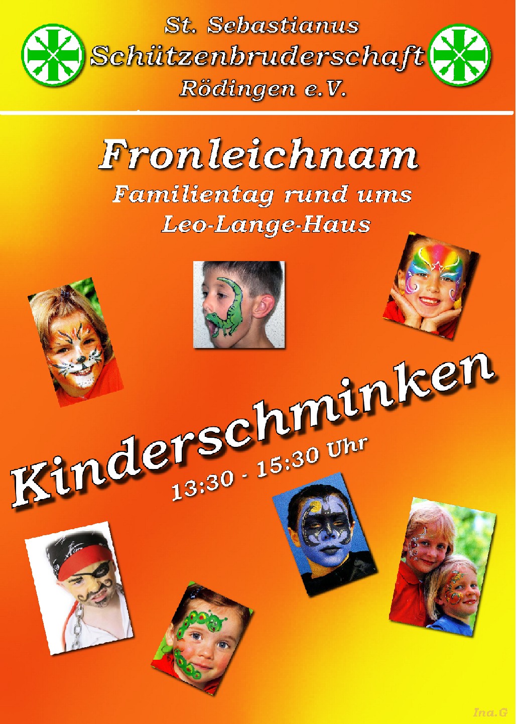 Ankündigung 09:00 Uhr Hl. Messe mit anschließender Fronleichnamsprozession in Rödingen ab 11.30 h Familientag rund ums Leo-Lange-Haus Riesenrutsche, Kinderanimation, Preisvogelschießen mit dem Kleinkaliber-Gewehr, Grillstand, Eis, Getränke, Cafeteria. ab 13.30 h Cafeteria geöffnet. ab 12.00 h Schießen der Ortsvereine um den Ortswanderpokal und Hans Weber Erinnerungstafel-Schießen für einen guten Zweck. ab 14.00 h Kinderanimation (bis ca. 16.00h) 16.00 h Majestätenschießen (Schülerprinz ab 12 Jahren, Prinzen ab 16 Jahren, König ab ca. 17:00 Uhr) Anschließend Übergabe der Insignien und Umzug um „klein Jülich“. Es spielt der Jugendmusikzug Fidelio Elsdorf. Die St. Sebastianus Schützenbruderschaft Rödingen wünscht allen Gästen einen erlebnisreichen Familientag rund ums Leo-Lange-Haus.
