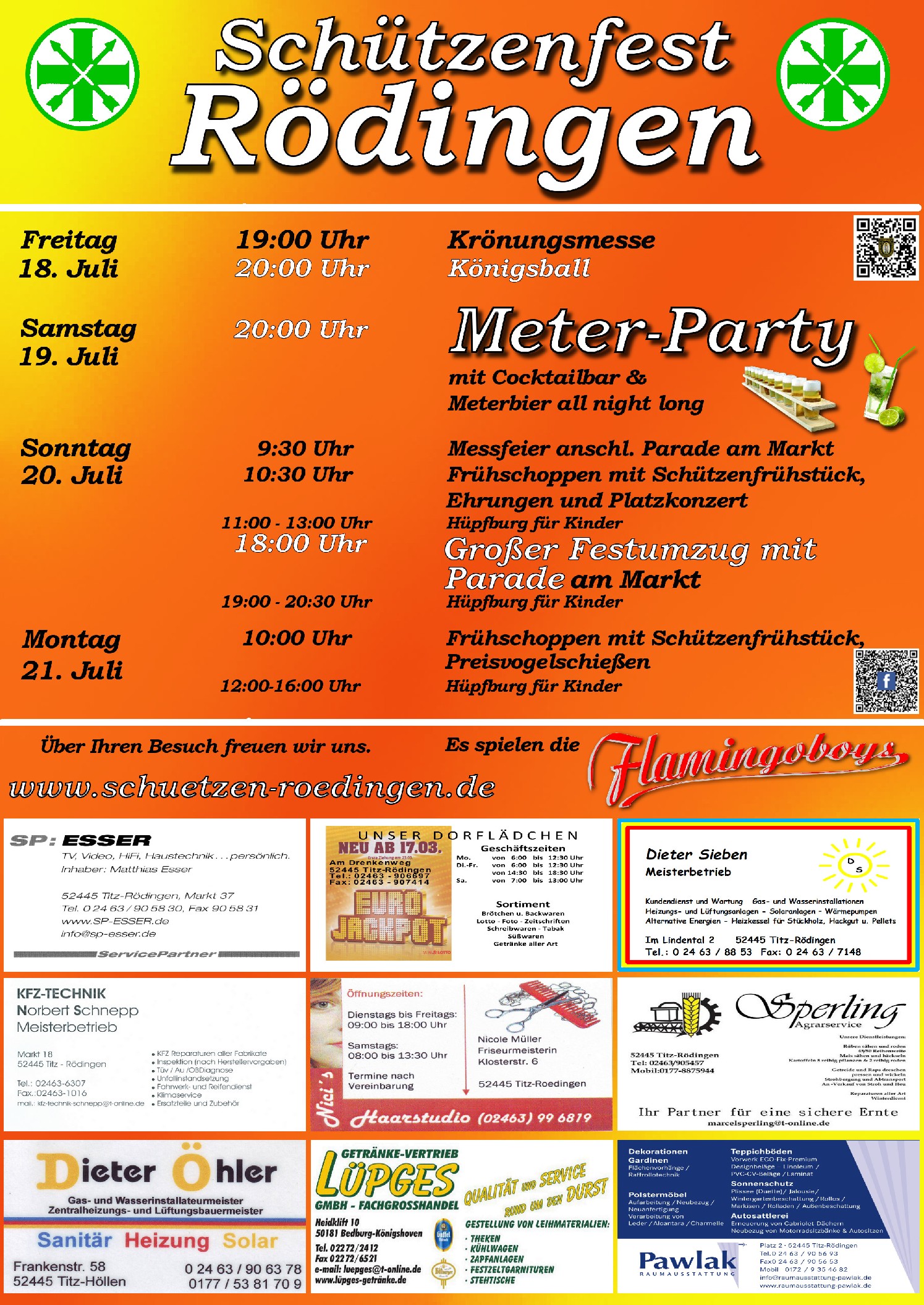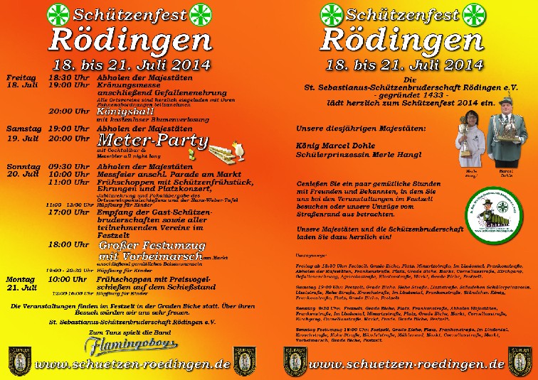 Fr. 18. Juli 2014: 20.00 Uhr Königsball und gratis Blumenverlosung Sa. 19. Juli 2014 20.00 Uhr Meter-Party für Jung und Alt. So. 20. Juli 2014 10.00 Uhr Messfeier für die Verstorbenen der Bruderschaft anschließend Parade auf dem Marktplatz. Frühschoppen mit Jubilarehrung und Pokalübergabe an die Sieger des Ortsvereinpokalschießen. 18.00 Uhr Großer Festumzug mit Parade anschließend gemütliches Beisammensein. Mo. 21. Juli 2014 10.00 Uhr Frühschoppen mit Preisvogelschießen und Verlosung vieler Sach- und Geldpreise