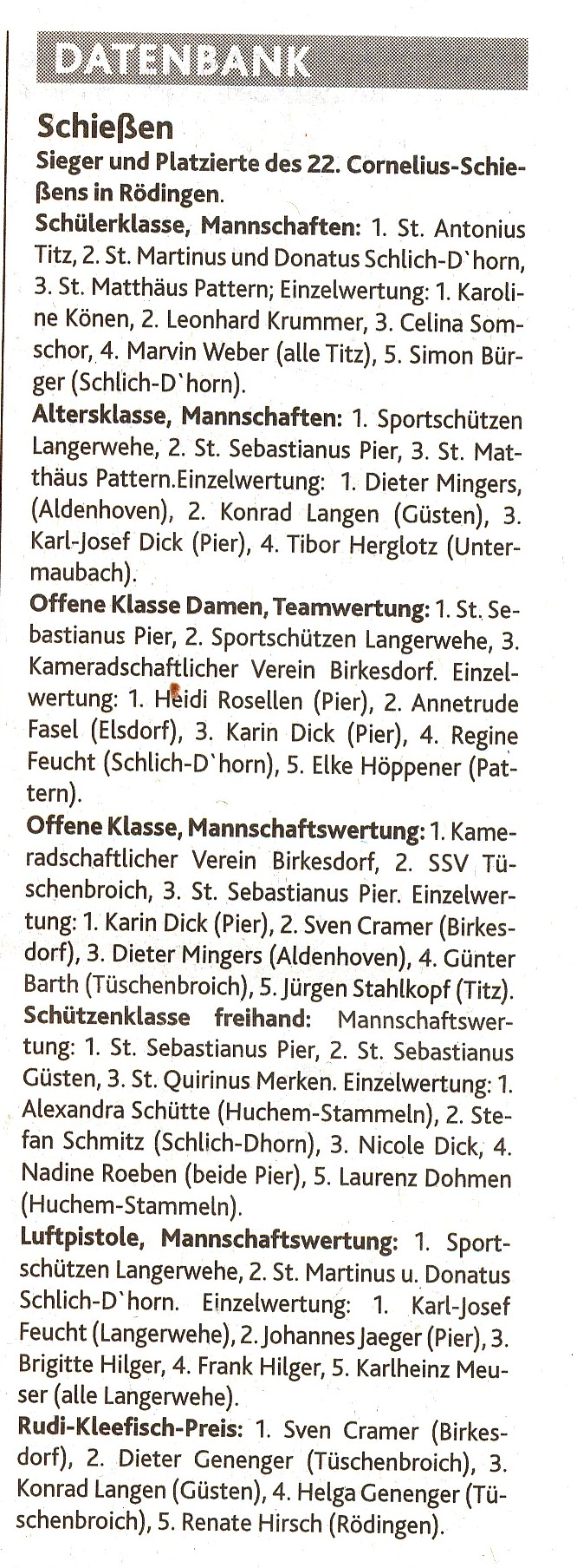 Es kann in jeder Klasse nur einmal gewonnen werden. Einzelschützen erhalten