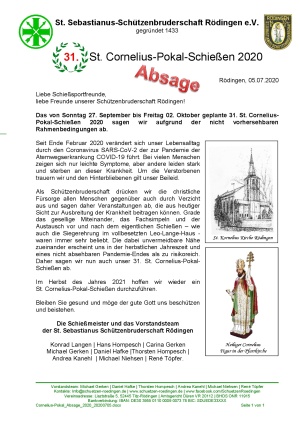Cornelius-Pokal-Schießen 2020 wurde aufgrund der nicht vorhersehbaren