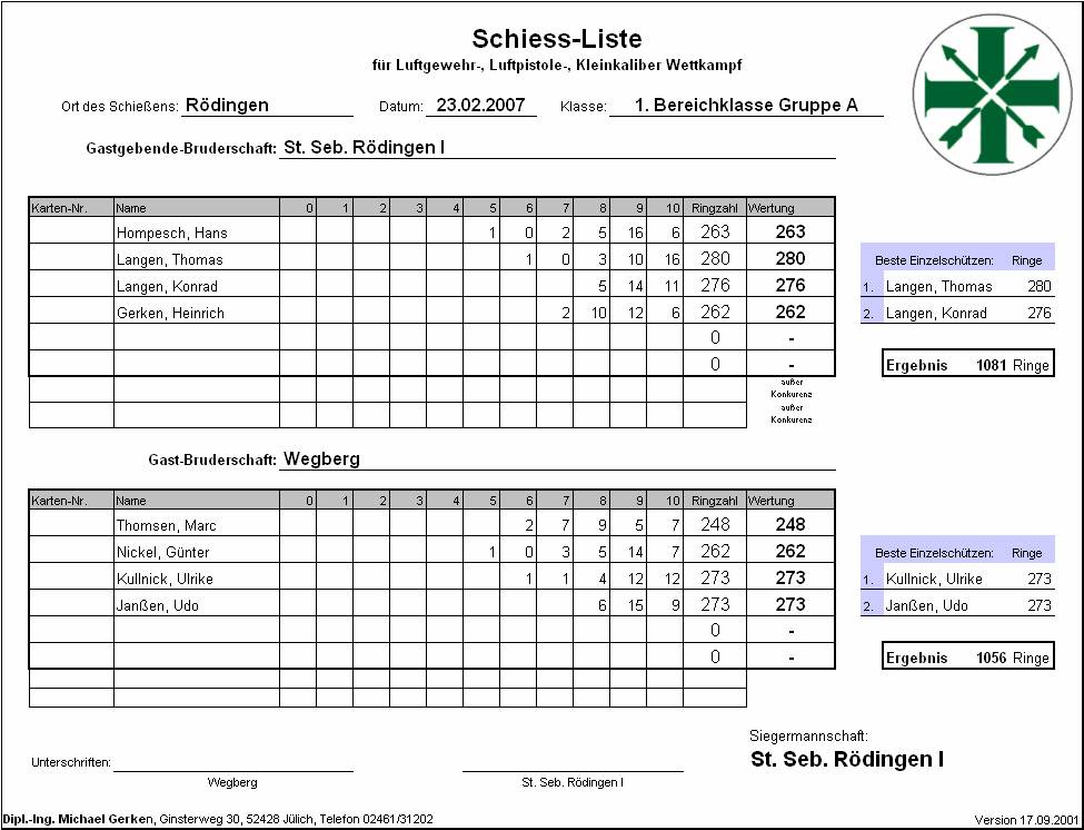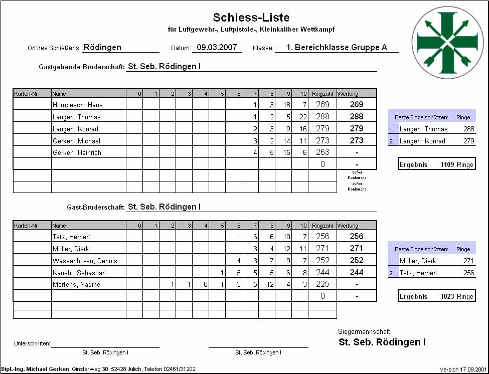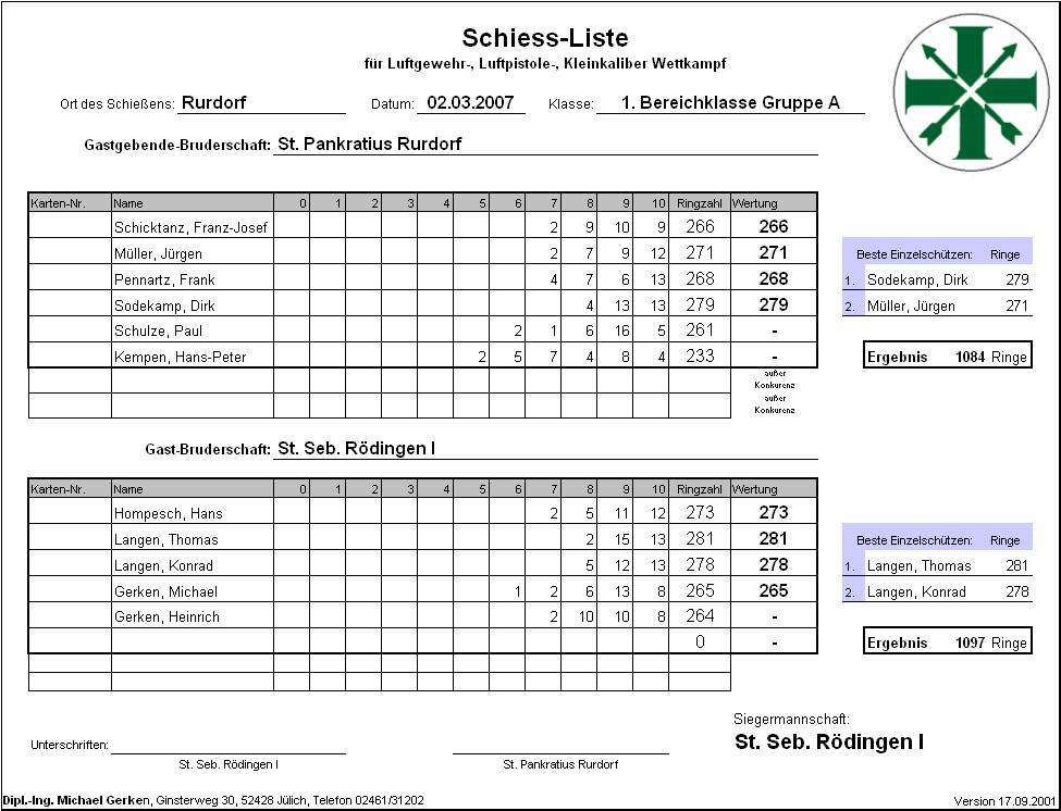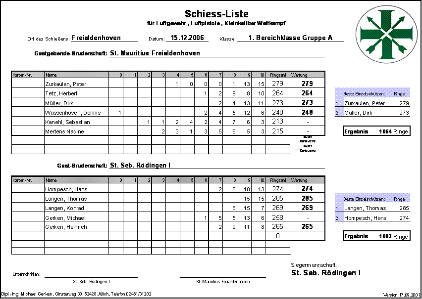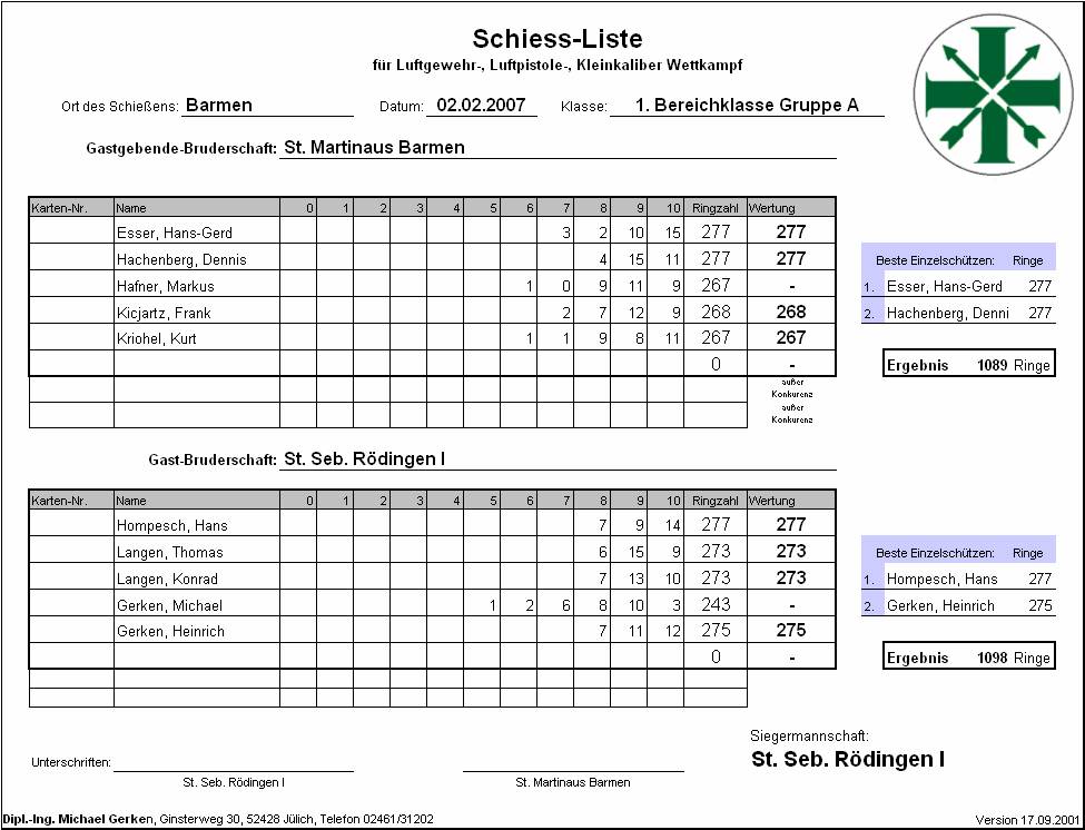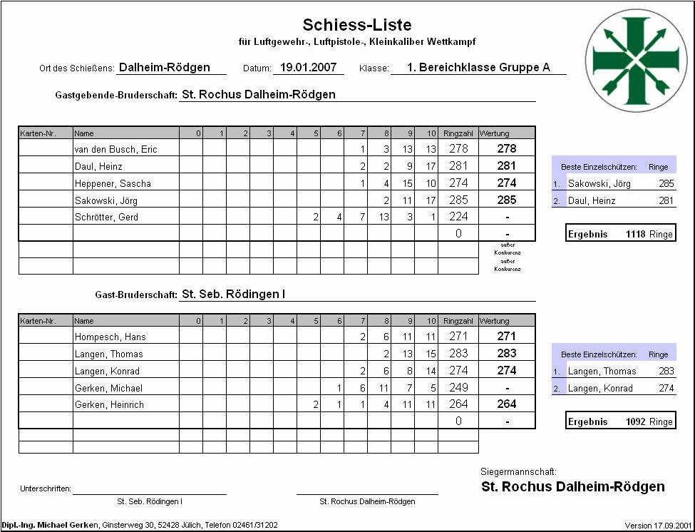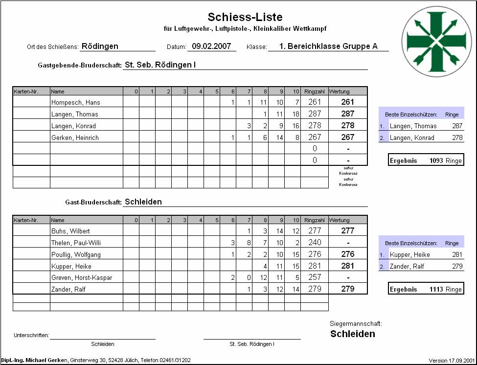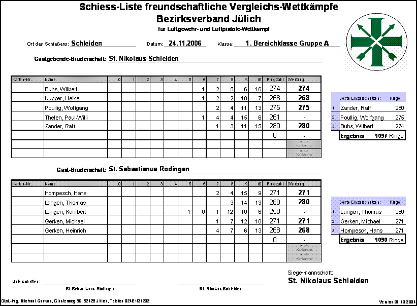 Einzelwertung mit zwei Streichergebnissen: 1. SAKOWSKI Jörg DALHEIM-RÖDGEN 14(14) 3483 290.25 295|285|287|290|293|296|290|288|285|283|291|284|293|290| 2. COMANNS Sven KÜCKHOVEN 14(14) 3437 286.42 284|284|281|287|293|286|288|288|287|283|279|288|288|280| 3. BEHRENS Torsten KÜCKHOVEN 14(14) 3386 282.17 284|282|281|277|284|277|278|283|277|272|282|288|290|280| 4. LANGEN Thomas RÖDINGEN 14(14) 3381 281.75 268|282|280|280|272|282|285|280|283|273|287|280|281|288| 5. SIMON Oliver KÜCKHOVEN 14(14) 3380 281.67 276|283|279|280|283|279|292|284|279|276|277|283|285|273| 6. DAHMEN Jens KÜCKHOVEN 14(14) 3379 281.58 282|288|282|278|280|275|275|286|279|277|285|285|275|282| 7. ZANDER Ralf SCHLEIDEN 14(14) 3372 281.00 278|289|284|280|283|284|272|275|280|279|279|281|278|277| 8. DAUL Heinz DALHEIM-RÖDGEN 14(14) 3345 278.75 278|275|278|272|282|278|281|279|281|278|278|278|275|279| 9. ZURKAULEN Peter FREIALDENHOVEN 13(14) 3335 277.92 271|279|277|273|285|279|279|281|287|266|274|276|274| 0| 10. HACHENBERG Dennis BARMEN 2 13(14) 3311 275.92 0|271|271|273|279|281|280|273|271|277|276|274|279|277| 11. SODEKAMP Dirk RURDORF 14(14) 3306 275.50 267|283|265|277|264|256|282|265|278|278|282|277|279|273| 12. POULLIG Wolfgang SCHLEIDEN 14(14) 3296 274.67 276|278|276|275|277|268|274|270|272|278|276|276|267|259| 13. MÜLLER Jürgen RURDORF 14(14) 3294 274.50 274|267|271|270|278|283|277|273|280|272|268|273|271|272| 14. LANGEN Konrad RÖDINGEN 14(14) 3292 274.33 264|276|275|258|244|274|269|276|274|273|278|276|278|279| 15. ESSER Hans-Gerd BARMEN 2 14(14) 3283 273.58 273|272|265|276|270|271|278|271|272|277|270|273|280|262| 16. HOMPESCH Hans RÖDINGEN 14(14) 3269 272.42 268|271|272|271|262|272|274|288|271|277|261|263|273|269| 17. HEPPENER Sascha DALHEIM-RÖDGEN 12(14) 3261 271.75 271|270|273|271|274| 0|271|268|274|259|278|278| 0|274| 18. KUPPER Heike SCHLEIDEN 13(14) 3260 271.67 273|269|271|268|266| 0|258|277|272|273|281|272|272|266| 19. KULLNICK Ulrike WEGBERG 14(14) 3260 271.67 271|267|267|263|275|281|267|273|269|277|276|273|264|263| 20. VAN DEN BUSCH Eric DALHEIM-RÖDGEN 14(14) 3256 271.33 274|273|268|272|264|269|273|275|278|268|266|265|254|275| 21. JANßEN Udo WEGBERG 14(14) 3251 270.92 262|274|273|276|270|267|275|268|271|270|263|273|262|271| 22. BUHS Wilbert SCHLEIDEN 14(14) 3248 270.67 273|266|270|274|273|267|264|270|268|275|277|271|263|259| 23. PENNARTZ Frank RURDORF 14(14) 3230 269.17 269|272|266|272|281|275|274|264|264|258|261|262|268|263| 24. KICKARTZ Frank BARMEN 2 13(14) 3226 268.83 268|257|269|269|263|276|273|259|273|268| 0|261|276|271| 25. KRICHEL Kurt BARMEN 2 13(14) 3190 265.83 262|260|266|262|264| 0|251|267|256|267|272|277|270|267| 26. GERKEN Heinrich RÖDINGEN 13(14) 3189 265.75 261|257|265|268| 0|272|265|263|264|275|267|262|264|263| 27. SCHICKDANZ Franz-Josef RURDORF 14(14) 3186 265.50 245|257|265|252|268|257|268|279|270|268|276|257|266|255| 28. SCHULZE Paul RURDORF 14(14) 3180 265.00 251|259|268|247|256|255|275|263|271|262|266|275|261|269| 29. NICKEL Günter WEGBERG 13(14) 3180 265.00 263|265|260|274|258| 0|263|263|273|265|257|262|269|265| 30. MÜLLER Dierk FREIALDENHOVEN 13(14) 3176 264.67 0|260|271|258|266|262|273|245|268|254|266|270|257|271| 31. JUSTEN Reinhard BARMEN 2 13(14) 3173 264.42 257|248|271|262|257|258|258|276|272| 0|270|273|256|263| 32. TETZ Herbert FREIALDENHOVEN 14(14) 3137 261.42 248|257|269|255|266|238|264|264|256|265|250|265|270|256| 33. GERKEN Michael RÖDINGEN 12(14) 3103 258.58 251|269|254|271|257|257|258|256|249|243| 0| 0|265|273| 34. THOMSON Marc WEGBERG 12(14) 3058 254.83 0|250|251|276|251|254|254|255|274| 0|259|248|236|250| 35. WASSENHOVEN Dennis FREIALDENHOVEN 13(14) 3055 254.58 258|261|263|247|262|263|248|240|253|234|254|254| 0|252| 36. LIEVRE Heinz KÜCKHOVEN 14(14) 3049 254.08 241|251|247|244|255|246|258|251|255|232|273|258|255|256| 37. SIMON Jürgen KÜCKHOVEN 14(14) 3024 252.00 262|244|234|216|252|258|254|264|248|242|257|254|249|240| 38. SCHRÖTTER Gerd DALHEIM-RÖDGEN 14(14) 2854 237.83 231|247|218|226|244|240|233|231|224|253|240|205|248|237| 39. GREVEN Horst-Kaspar SCHLEIDEN 11(14) 2829 257.18 254|253| 0| 0|265|242|257|265| 0|266|257|265|252|253| 40. THELEN Paul-Willi SCHLEIDEN 11(14) 2807 255.18 255|266|255|261|266|244| 0| 0|260|237|240|265| 0|258| 41. HAFNER Markus BARMEN 2 10(14) 2671 267.10 255| 0| 0| 0| 0|272|266|271|260|267|273|273|267|267| 42. BÖHNEN Guido DALHEIM-RÖDGEN 9(14) 2499 277.67 280|278|275|283|277|276|270| 0| 0| 0|281|279| 0| 0| 43. BARTH Günter WEGBERG 9(14) 2216 246.22 0|246|254|257|248|265|240|241| 0|232|233| 0| 0| 0| 44. KANEHL Sebastian FREIALDENHOVEN 10(14) 2216 221.60 0|226|215| 0| 0| 0|213|207|233|216|221|211|230|244| 45. MERTENS Nadine FREIALDENHOVEN 8(14) 1776 222.00 0| 0| 0| 0| 0| 0|215|220|204|212|233|244|223|225| 46. PRINZ Udo BARMEN 2 5(14) 1273 254.60 241| 0|259|268|258| 0| 0| 0| 0| 0| 0| 0| 0|247| 47. KEMPEN Hans-Peter RURDORF 4(14) 890 222.50 0| 0| 0| 0| 0| 0| 0| 0| 0| 0|206|234|233|217| 48. FELDEN Paul BARMEN 2 1(14) 280 280.00 0| 0| 0| 0| 0| 0| 0| 0| 0| 0|280| 0| 0| 0| 49. KRICHEL Thomas FREIALDENHOVEN 1(14) 232 232.00 0| 0|232| 0| 0| 0| 0| 0| 0| 0| 0| 0| 0| 0|