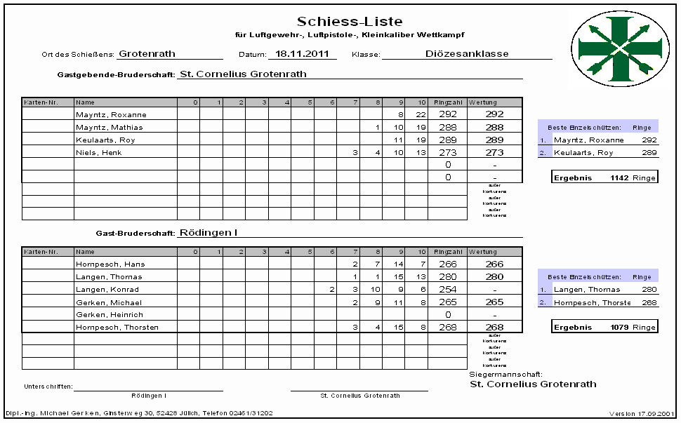 Infos zu den Mannschaften LG der Diözesanklasse Aachen Bereich Mitte St. Cornelius Grotenrath Schießstand :Wald Str.Gaststätte Schummertz Mannschaftsführer : Henk Niels, Eikehof 1, NL 6374 Landgraaf Tel. 0031 / 653414932; E.-Mail: Heniels@MSN.com