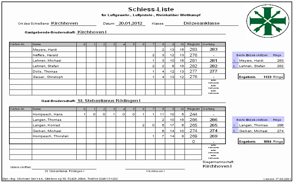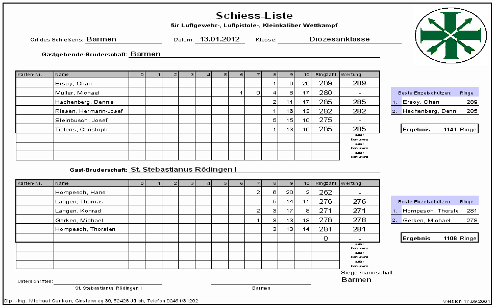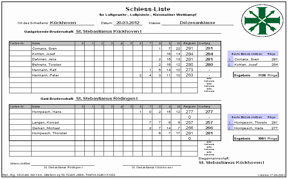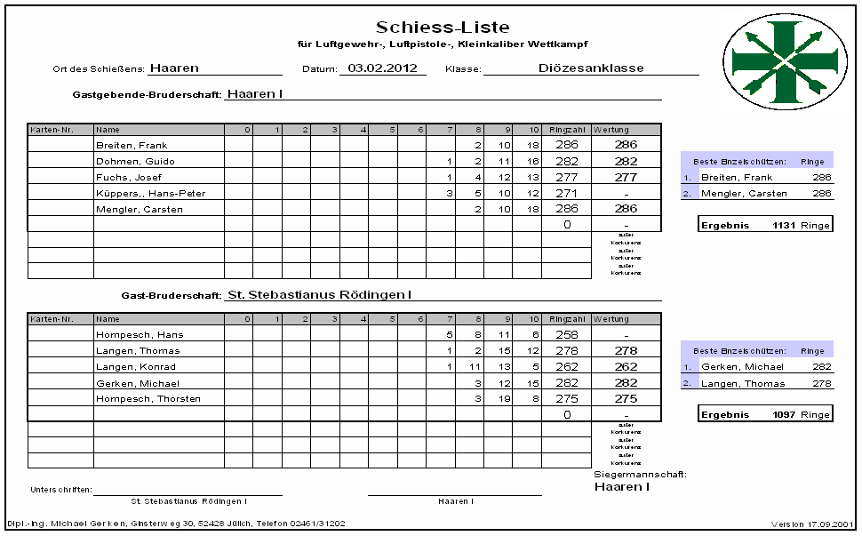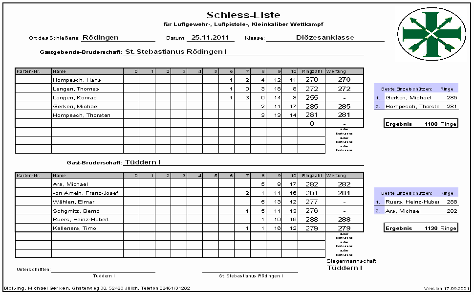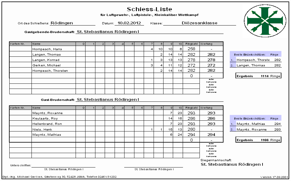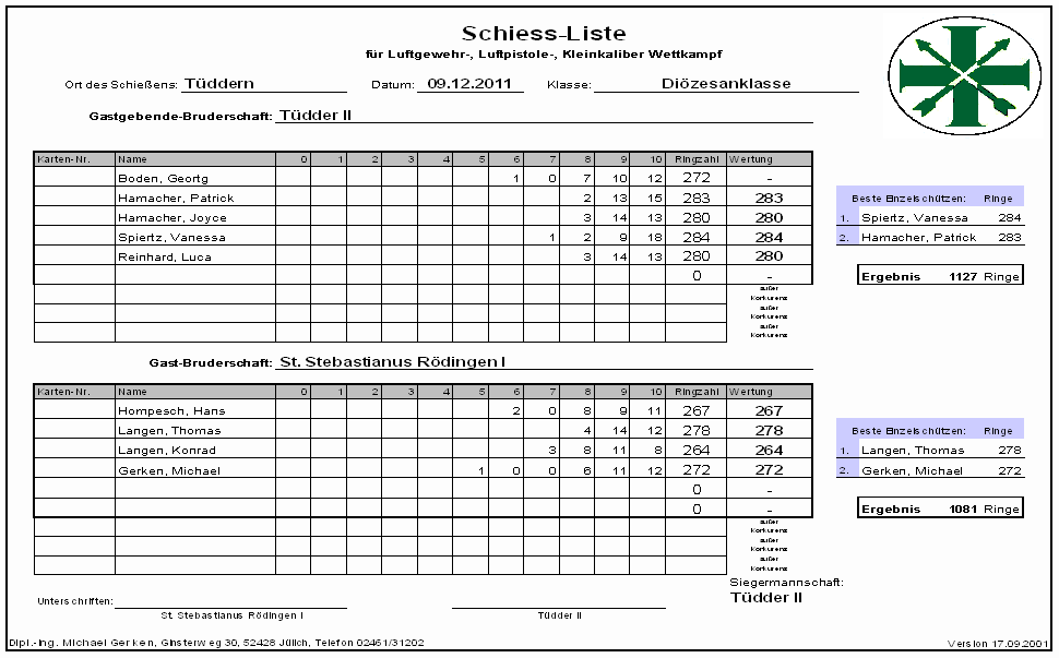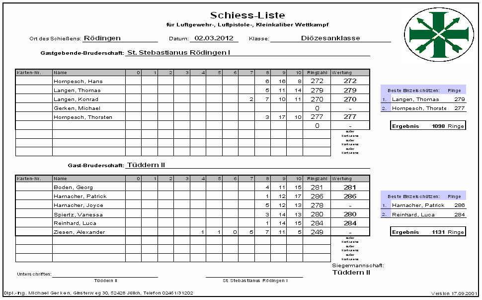 St. Sebastianus Tüddern II Schießstand :Rodebachstr. 24 Mannschaftsführer : Georg Boden, Birderstr. 76a, 52538 Selfkant - Tüddern Tel. 0177 / 7519247; E.-Mail: georg_boden@web.de