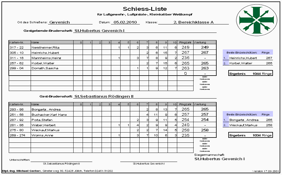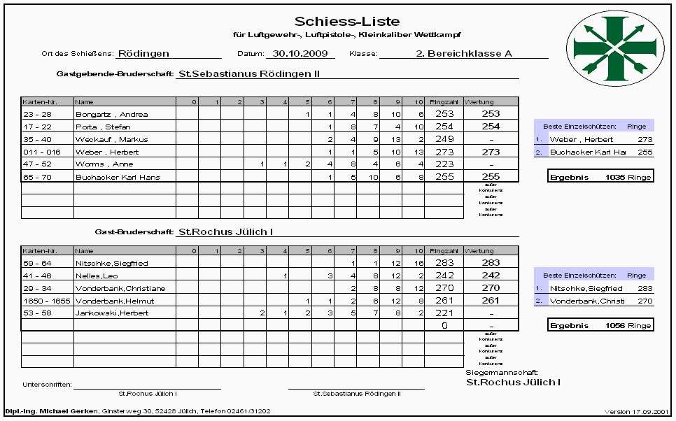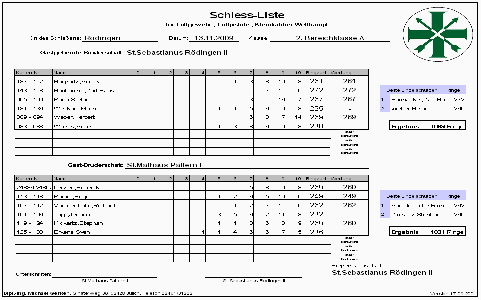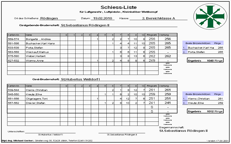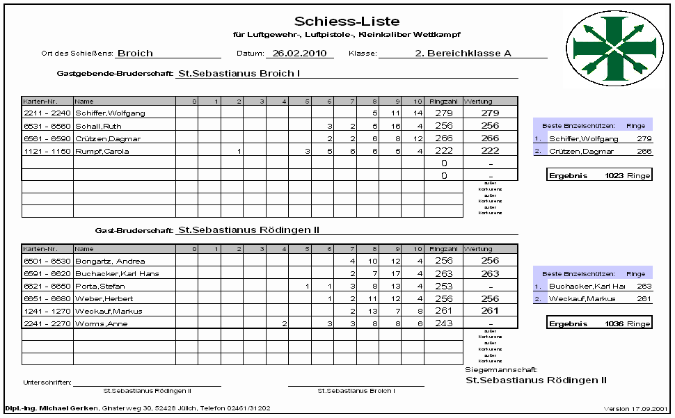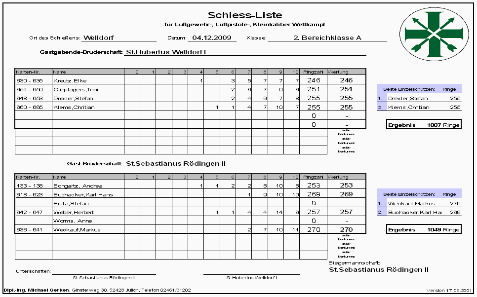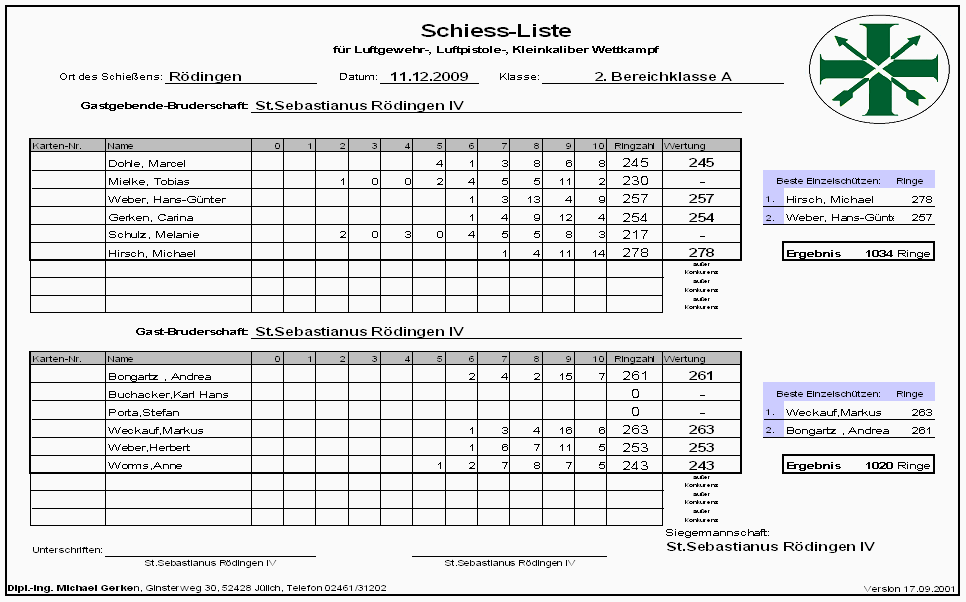 Einzelwertung mit Zwei Streichergebnissen 1. Zurkaulen Peter Freialdenhoven 14(14) 3374 281.17 276|279|281|282|273|274|271|285|285|287|287|284|279|275| 2. Nitschke Siegfried Jülich I 14(14) 3367 280.58 283|283|273|283|286|280|287|276|281|278|272|279|277|274| 3. Schiffer Wolfgang Broich I 14(14) 3309 275.75 268|277|270|274|271|281|283|270|273|280|273|269|279|278| 4. Domath Sascha Gevenich I 14(14) 3271 272.58 261|277|272|275|270|277|272|275|270|270|263|266|277|270| 5. Vonderbank Christiane Jülich I 13(14) 3253 271.08 270|262|278|274|279|265|269|276|269|268|267|263| 0|275| 6. Müller Dirk Freialdenhoven 14(14) 3236 269.67 254|270|262|277|278|261|263|274|278|268|265|269|271|248| 7. Vonder Lohe Richard Pattern I 13(14) 3226 268.83 254|259|262|270|274|278|270|265|274|271|269| 0|266|268| 8. Korbel Walter Gevenich I 14(14) 3225 268.75 262|276|263|263|274|257|267|270|256|272|265|259|279|275| 9. Schall Ruth Broich I 14(14) 3216 268.00 250|264|266|264|266|281|277|271|258|271|268|263|256|267| 10. Kanehl Sebastian Freialdenhoven 14(14) 3214 267.83 269|272|264|269|261|268|255|266|268|268|269|264|269|268| 11. Weber Hans-Günter Rödingen IV 14(14) 3202 266.83 253|277|254|261|265|266|257|273|264|264|270|273|262|270| 12. Weber Herbert Rodingen II 14(14) 3187 265.58 273|270|269|264|257|273|253|264|269|260|240|262|256|270| 13. Buchacker Karl -Hans Rodingen II 12(14) 3175 264.58 255|261|272|274|269|265| 0| 0|258|270|257|265|263|266| 14. Crützen Dagmar Broich I 13(14) 3170 264.17 0|258|255|261|257|252|267|272|271|257|278|262|266|266| 15. Klems Christian Welldorf I 14(14) 3164 263.67 258|266|263|267|255|259|263|268|264|268|261|261|256|266| 16. Bongartz Andrea Rodingen II 14(14) 3160 263.33 253|225|261|268|253|268|261|269|266|262|265|256|256|275| 17. Tetz Herbert Freialdenhoven 12(14) 3156 263.00 0|246|267|274|271|274| 0|262|258|268|255|262|266|253| 18. Mannheims Heinz Gevenich I 14(14) 3152 262.67 259|261|257|263|269|255|255|273|260|273|236|257|258|267| 19. Weckauf Markus Rodingen II 14(14) 3148 262.33 249|267|255|268|270|255|263|263|271|259|258|255|261|258| 20. Vonderbank Helmut Jülich I 13(14) 3129 260.75 261|256|264|249|255|267|263|262|262|267|260|249| 0|263| 21. Kickartz Stefan Pattern I 14(14) 3128 260.67 261|262|260|264|252|257|266|254|262|264|256|253|269|253| 22. Heinrichs Hubert Gevenich I 13(14) 3119 259.92 254|259|255| 0|265|253|261|259|254|266|267|266|260|252| 23. Hirsch Michael Rödingen IV 14(14) 3101 258.42 209|225|261|258|266|261|278|263|249|253|254|266|246|246| 24. Nersheimer Rita Gevenich I 14(14) 3100 258.33 263|257|256|260|254|262|260|258|252|256|249|254|263|257| 25. Drexler Stefan Welldorf I 14(14) 3059 254.92 247|249|248|254|255|247|253|255|255|270|265|241|252|256| 26. Kreutz Elke Welldorf I 14(14) 3051 254.25 258|254|257|244|246|223|255|248|251|256|255|259|256|256| 27. Pörner Birgit Pattern I 14(14) 3006 250.50 248|242|249|241|231|243|258|249|247|254|245|259|265|247| 28. Oligslager Toni Welldorf I 14(14) 2972 247.67 248|257|242|236|251|252|249|250|244|241|232|251|251|234| 29. Mielke Tobias Rödingen IV 14(14) 2955 246.25 241|246|248|227|240|262|230|219|255|238|262|245|241|247| 30. Nelles Leo Jülich I 13(14) 2952 246.00 242| 0|251|239|225|246|251|245|254|240|241|235|251|257| 31. Dohle Marcel Rödingen IV 14(14) 2948 245.67 235|240|175|211|242|214|245|248|253|246|266|257|257|245| 32. Jankowski Herbert Jülich I 13(14) 2869 239.08 221| 0|250|244|222|240|233|255|237|245|228|241|236|238| 33. Worms Anne Rodingen II 13(14) 2843 236.92 223|232|238|229| 0|224|243|244|235|230|235|249|243|241| 34. Gerken Carina Rödingen IV 12(14) 2836 236.33 241| 0|204|239|245|235|254|239|237|241|228|245| 0|228| 35. Kück Sascha Pattern I 12(14) 2806 233.83 249|231| 0|244|241|220|195|226| 0|221|239|233|259|248| 36. Rumpf Carola Broich I 13(14) 2711 225.92 170| 0|229|204|227|199|246|216|229|236|253|226|222|224| 37. Malejka Jan Broich I 12(14) 2426 202.17 187|197|214|191| 0|202|194|174|195|227|227|207| 0|211|